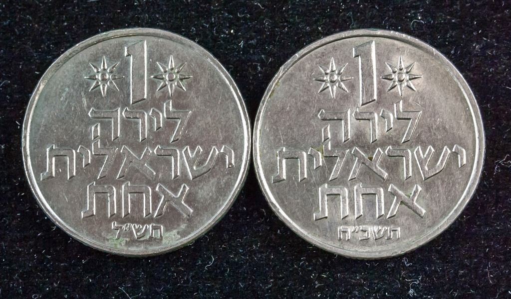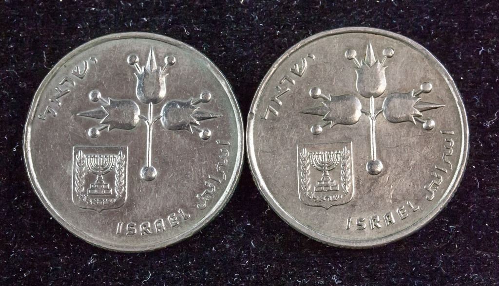 Lot of 8 coins from Israel. Obverse: Three stylized grenadine fruits, state emblem (menorah flanked by olive branches). Lettering in Arabic, Hebrew, and Latin. Reverse: Value, 2 stars. Lettering in Hebrew. Diameter: 3 cm.