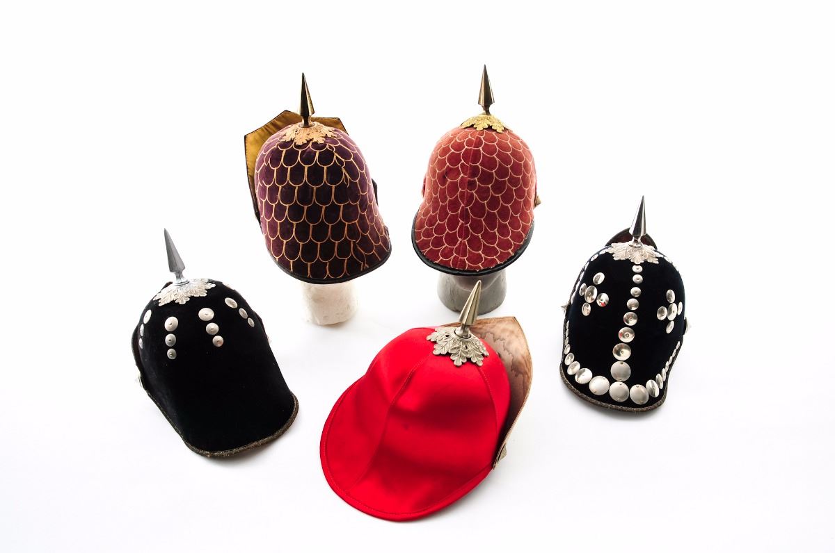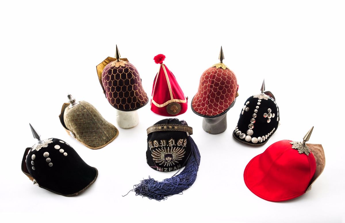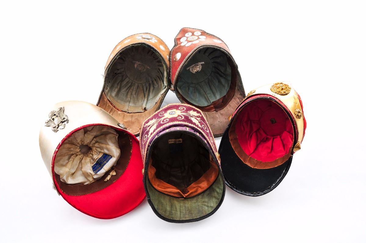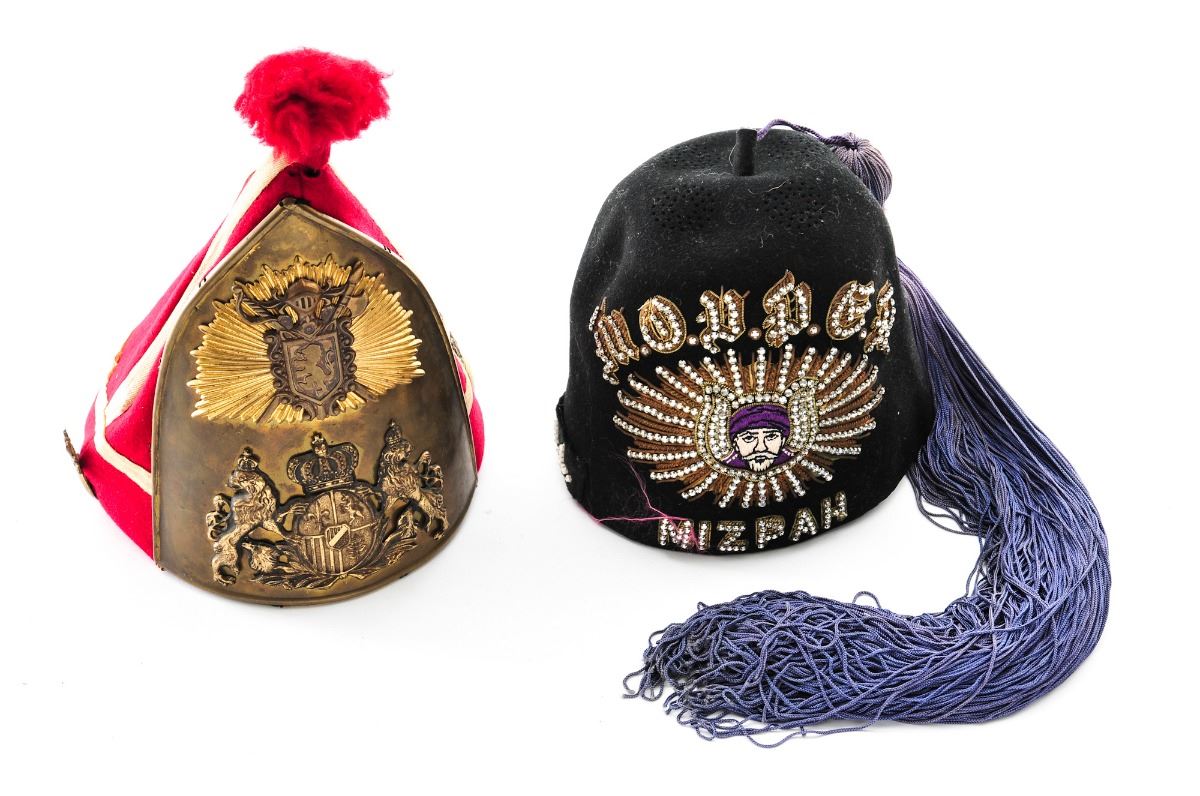 Lot of Eight (8) Masonic, Fraternal and Theatrical Hats, one with Florida Masons pin and a highly decorated fez with sequins and wire cord. Mfg'rs include M.C. Lilley, Pettibone Bros., etc. An interesting lot. Condition to all is very good showing normal signs of age and wear. Est.: $200-$350/lot.