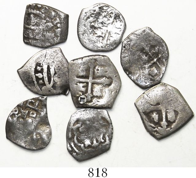 Lot of 8 Mexico City, Mexico, cob 1R (2) and 1/2R (6), various periods and assayers (where visible). 14.08 grams total. VG on average (not much detail), mostly toned, one with hole near edge.