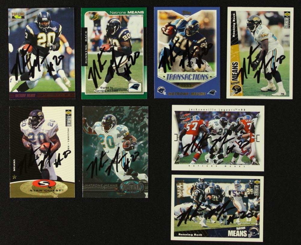 All 8 cards have been hand-signed in black felt-tip pen by Natrone Means. Autographs include an authentication guarantee and LOA from Pristine Auction.