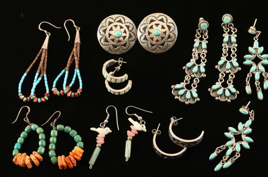 Including; sterling silver discs with floral motif and single turquoise stone marked 'JF' and 'Sterling', two pairs sterling and turquoise dangles, two pairs sterling semi circles-one with opals, two pairs turquoise and stone earrings, and a pair of bird fetish earrings.