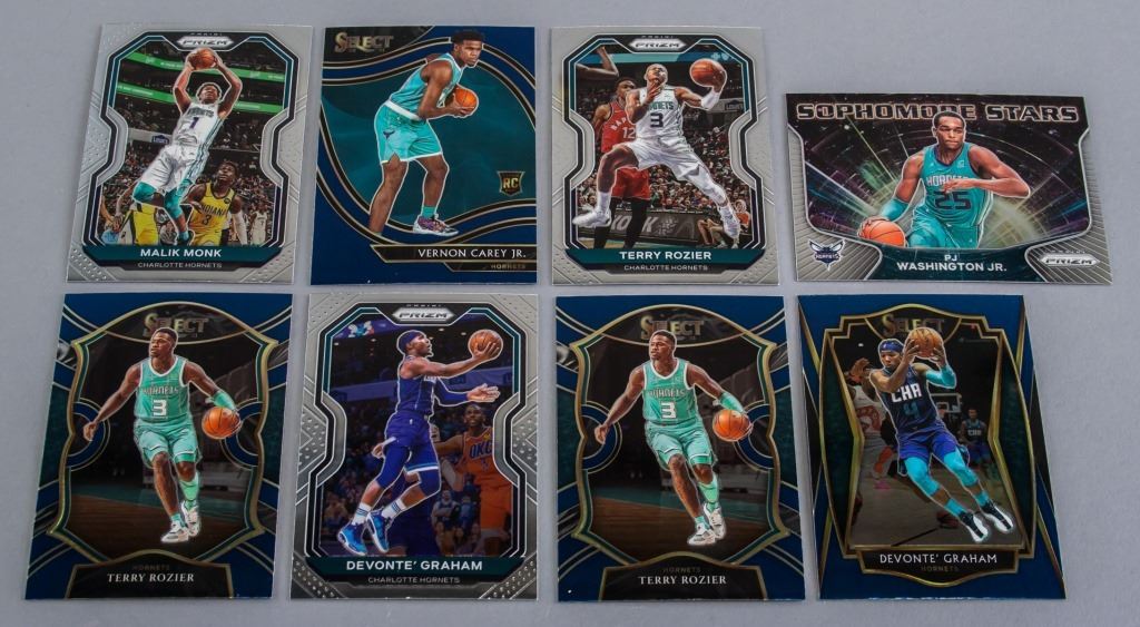 Lot of eight basketball cards. Featuring Malik Monk, Vernon Carey Jr., Terry Rozier, PJ Washington Jr., and Devonte' Graham.