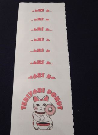 This is a lot of 8 prop "Teriyaki Donuts" napkins screen used in the Quentin Tarantino film "Jackie Brown." These items are accompanied by a letter of authenticity from Star Wares.