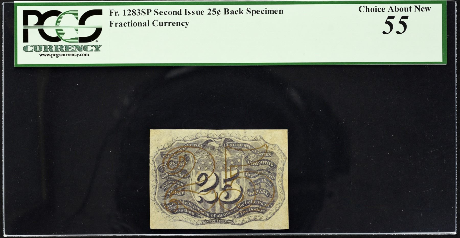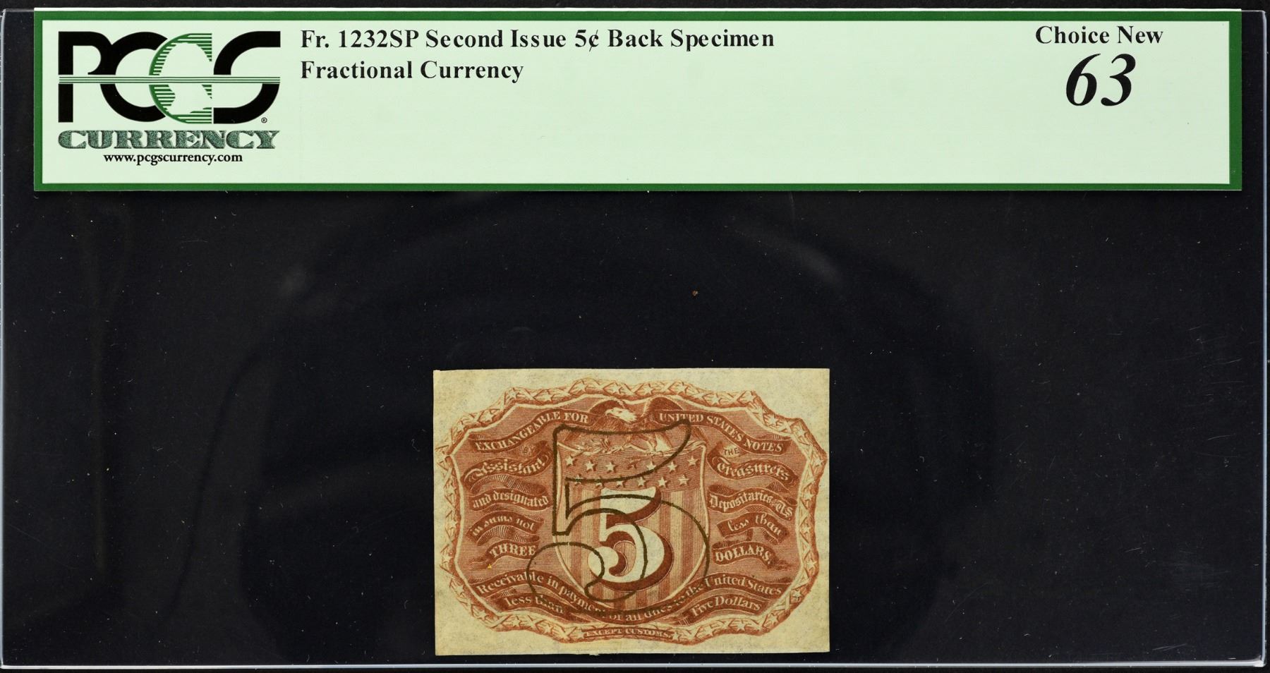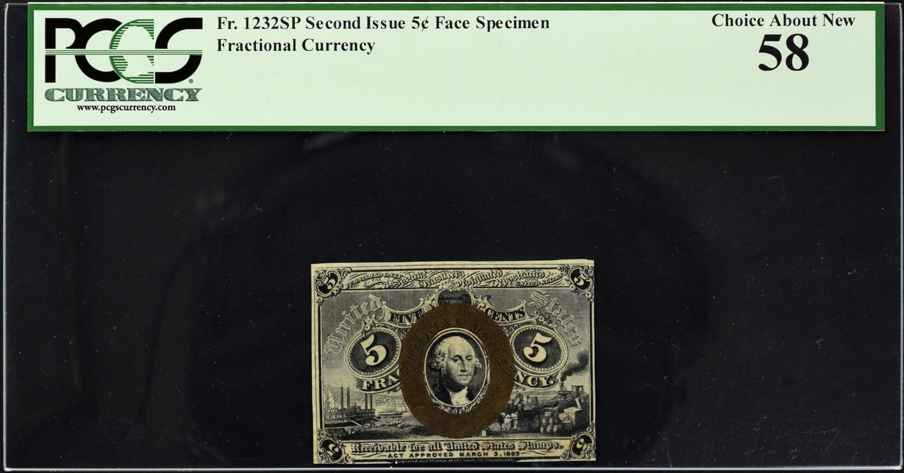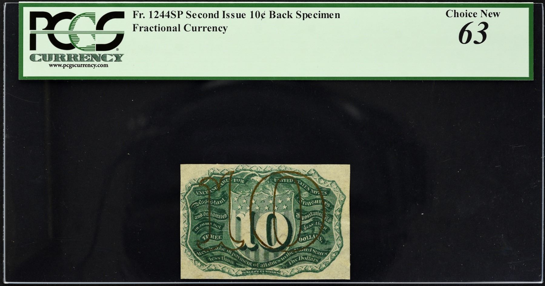 A full set of face and backs of all denominations for this second issue in specimen form with the following; Fr. 1232sp face in Choice About New 58; Fr. 1232sp back in Choice New 63 with the comments "Minor Mounting Remnants on Back from Shield."; Fr. 1244 face in Choice About New 55 with the comments "Minor Mounting Remnants on Back from Shield."; Fr. 1244sp back in Choice New 63 with the comments "Minor Mounting Remnants on Back from Shield."; Fr. 1283sp face in Choice About New 55 with the comments "Minor Mounting Remnants on Back from Shield."; Fr. 1283sp back in Choice About New 55 with the comments "Minor Mounting Remnants on Back from Shield."; Fr. 1314sp face in Choice About New 55 with the comments "Minor Mounting Remnants on Back from Shield."; Fr. 1314sp back in Gem New 65 PPQ.