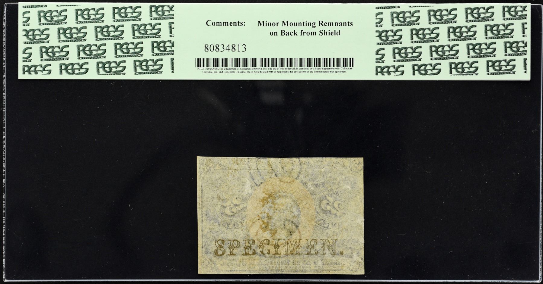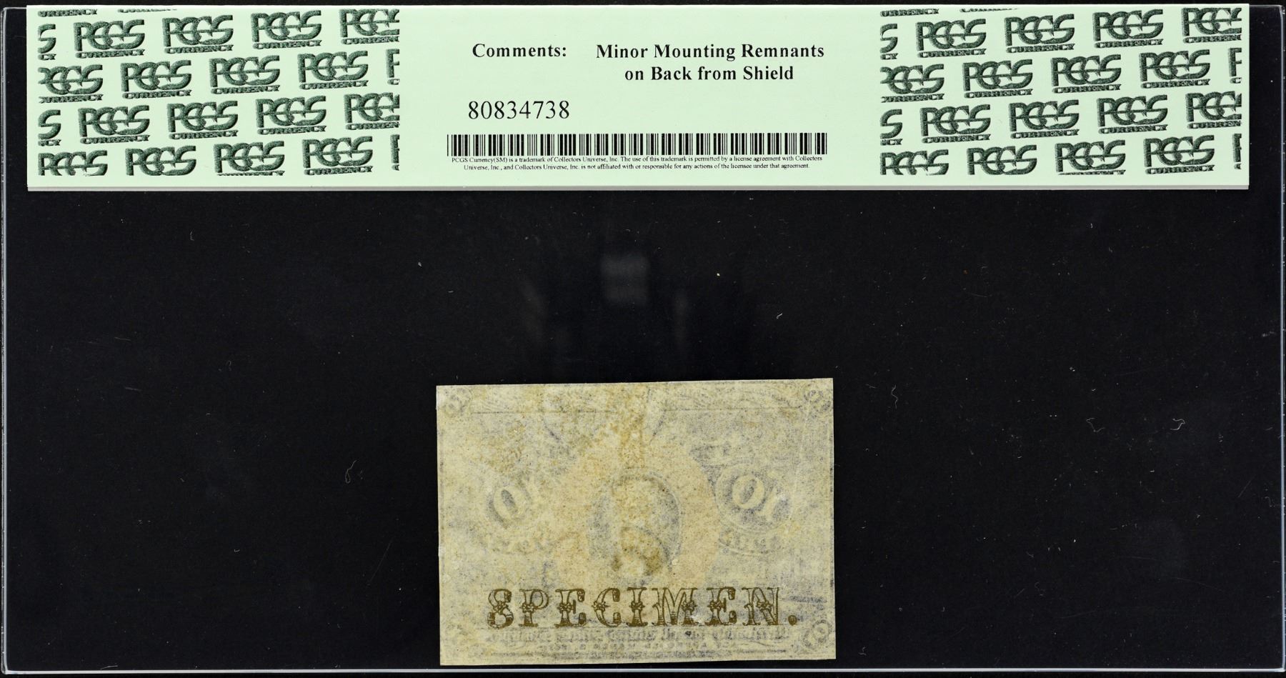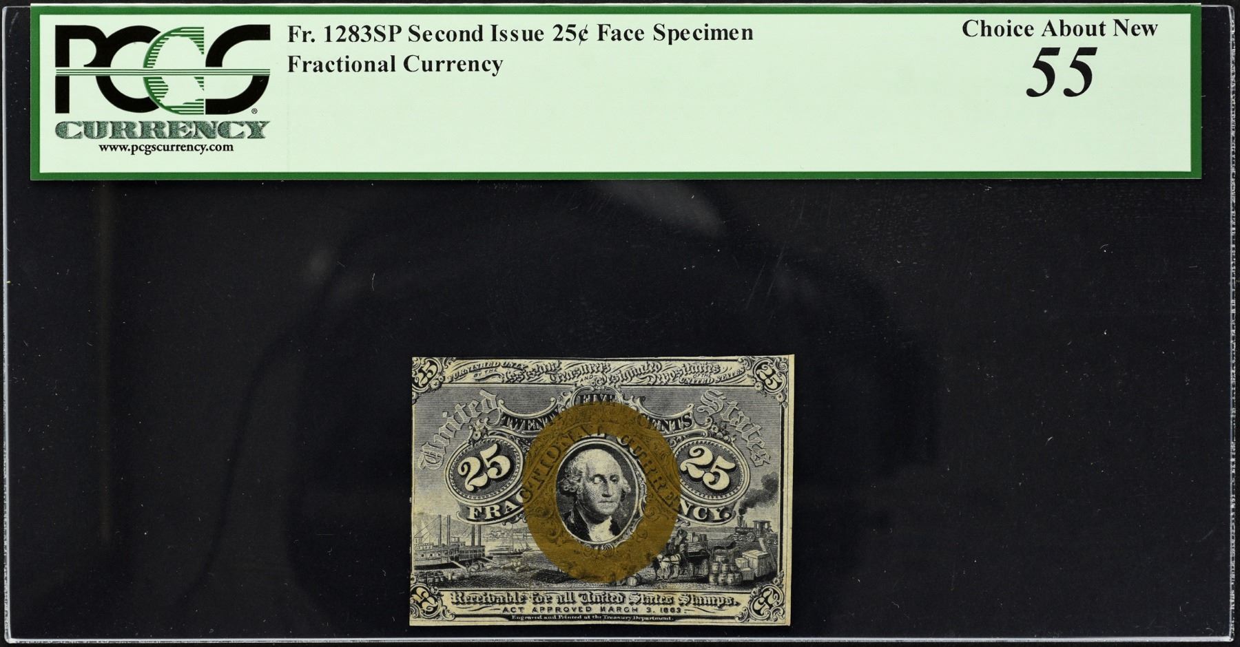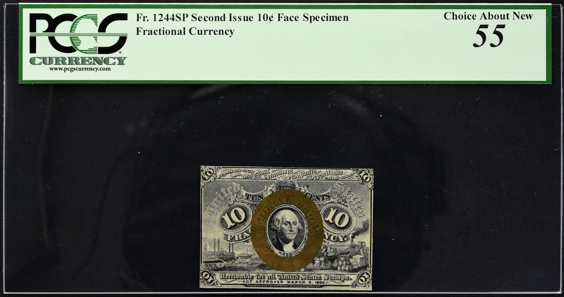 A full set of face and backs of all denominations for this second issue in specimen form with the following; Fr. 1232sp face in Choice About New 58; Fr. 1232sp back in Choice New 63 with the comments "Minor Mounting Remnants on Back from Shield."; Fr. 1244 face in Choice About New 55 with the comments "Minor Mounting Remnants on Back from Shield."; Fr. 1244sp back in Choice New 63 with the comments "Minor Mounting Remnants on Back from Shield."; Fr. 1283sp face in Choice About New 55 with the comments "Minor Mounting Remnants on Back from Shield."; Fr. 1283sp back in Choice About New 55 with the comments "Minor Mounting Remnants on Back from Shield."; Fr. 1314sp face in Choice About New 55 with the comments "Minor Mounting Remnants on Back from Shield."; Fr. 1314sp back in Gem New 65 PPQ.