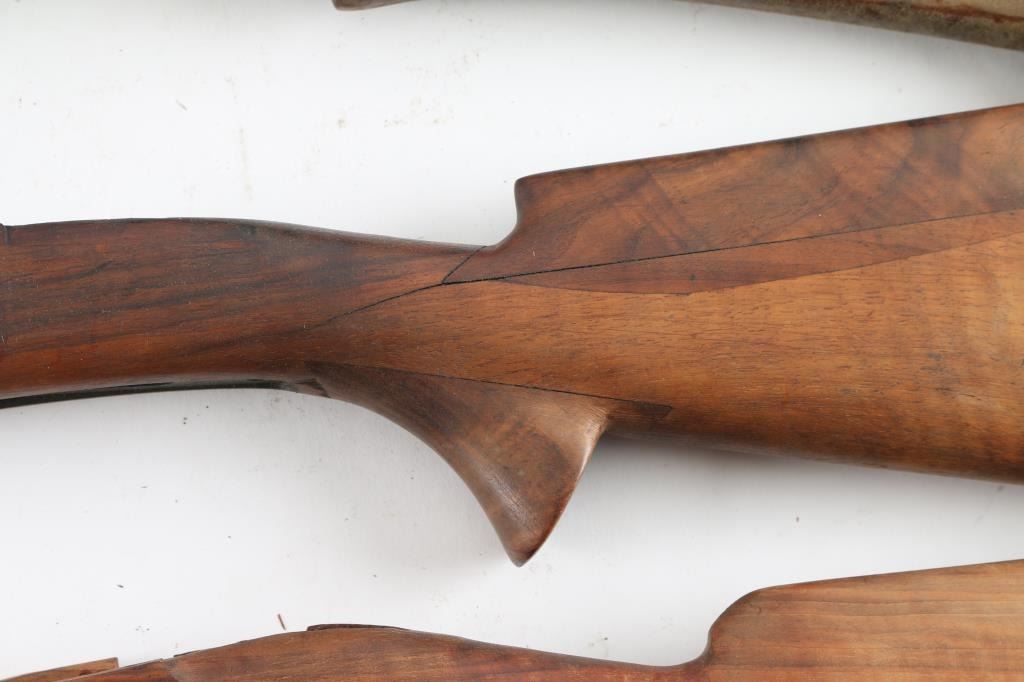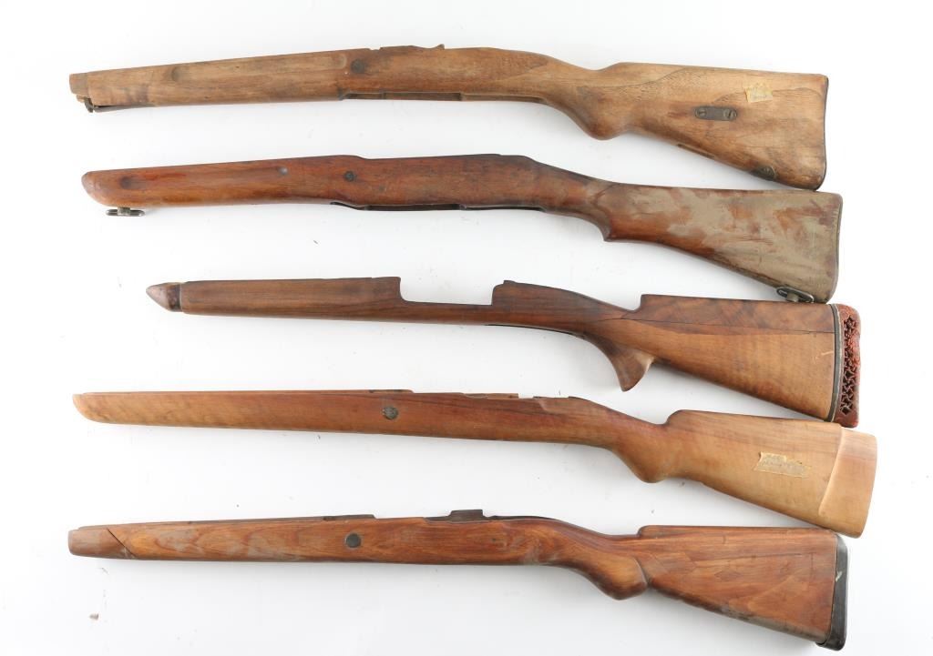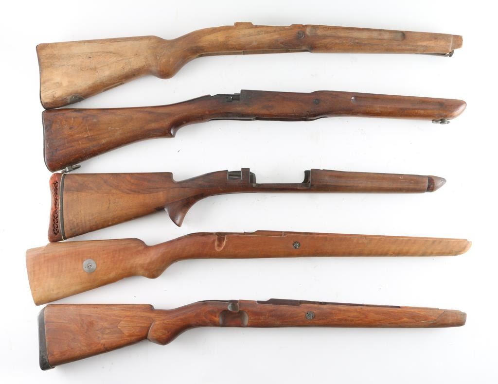previously military stocks that have had forends shortened and re-shaped. Various models, including Mauser, Springfield 1903, Krag. Condition ranges from Fair with cracks to very good.