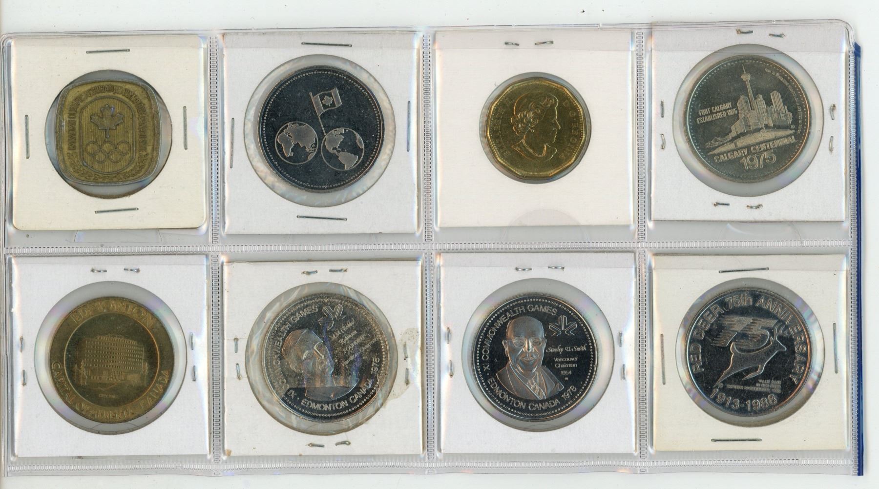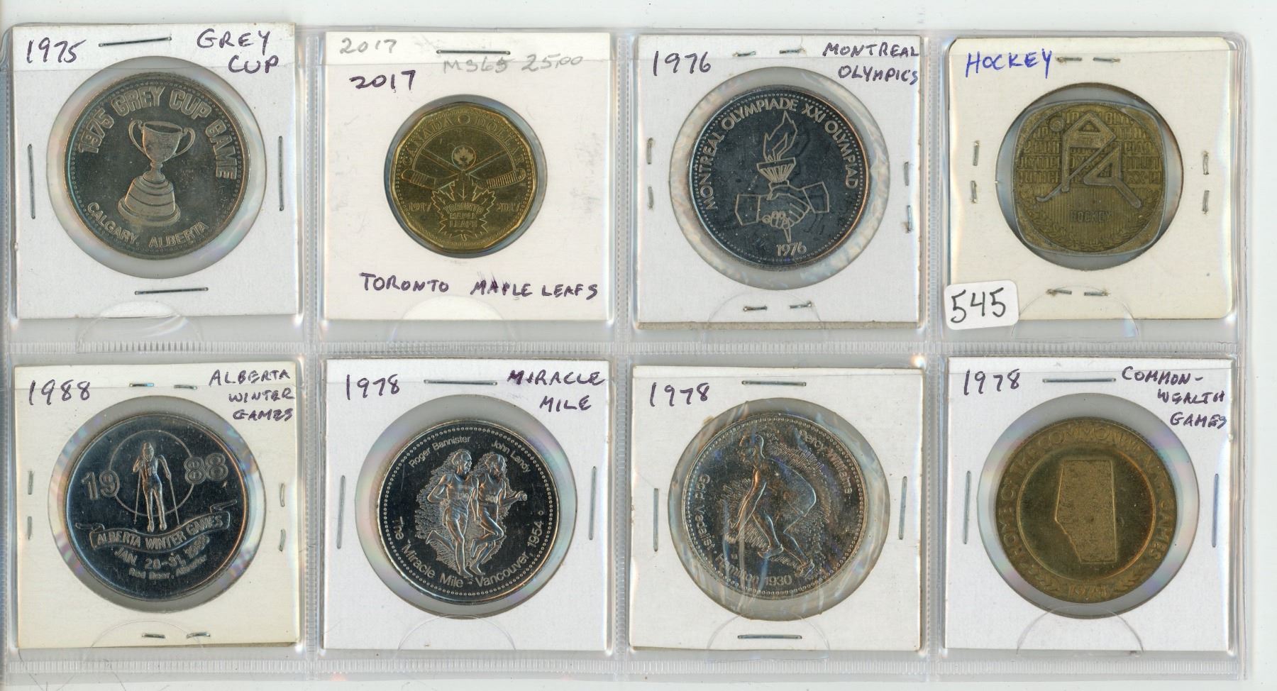 Lot of 8 Sports medals, coins & tokens. Includes Grey Cup, Toronto Maple Leaf's, Montreal Olympics, Hockey, Alberta Winter Games, Miracle Mile, Track & Field, & Commonwealth Games.