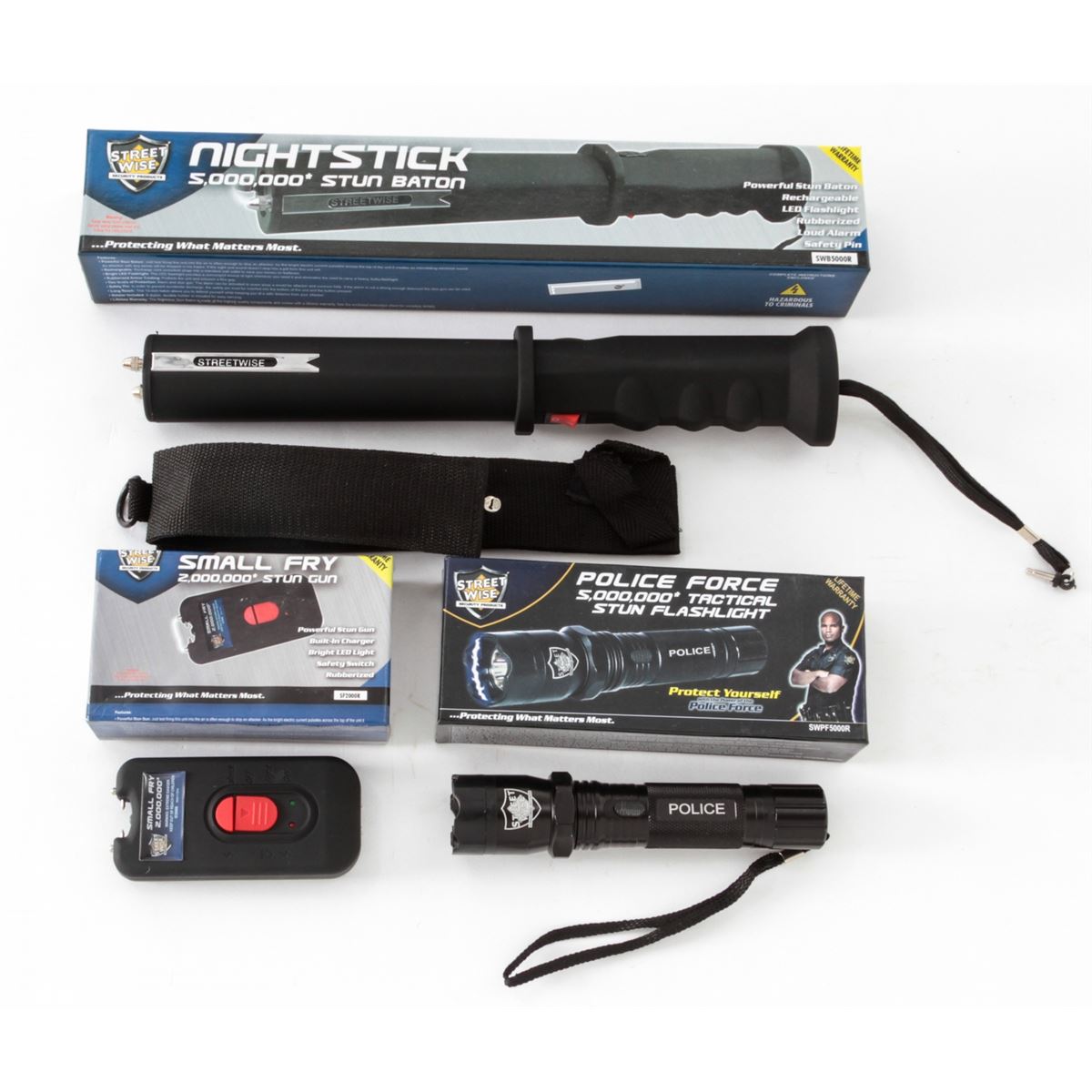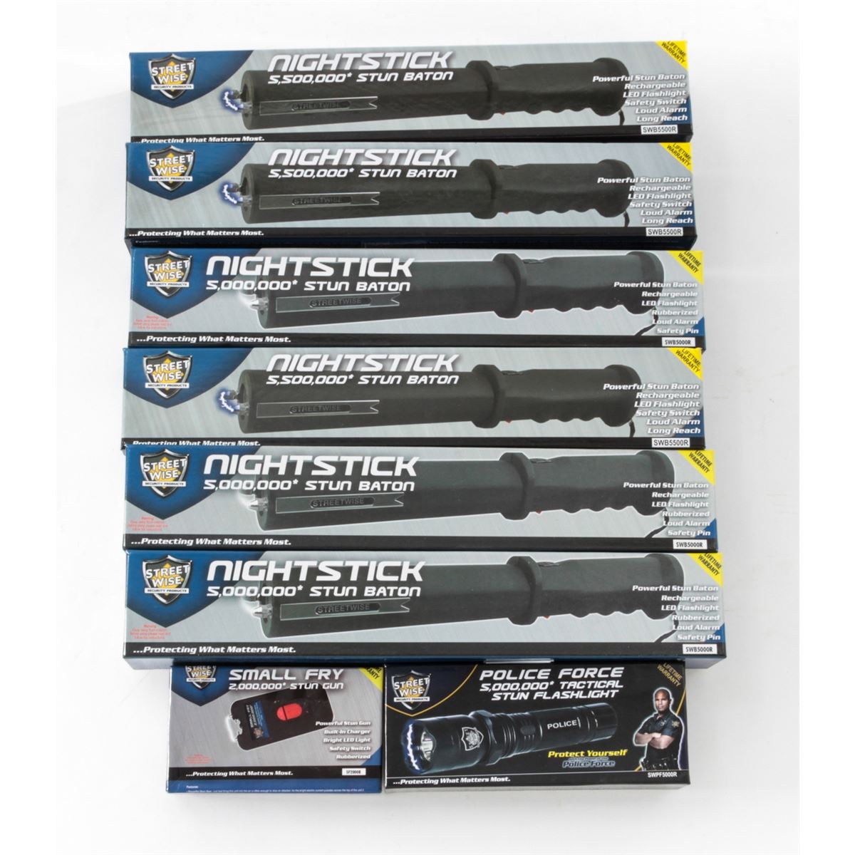 Dealer's Lot of Eight (8) StreetWise Stun Guns, including seven (7) Nightsticks, one Police Force, and one Small Fry. All brand new in original boxes with cases. Retails @ over $525/lot. Est.: $300-$400/lot. (Field Time)
