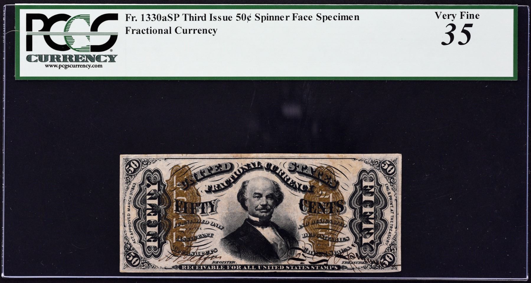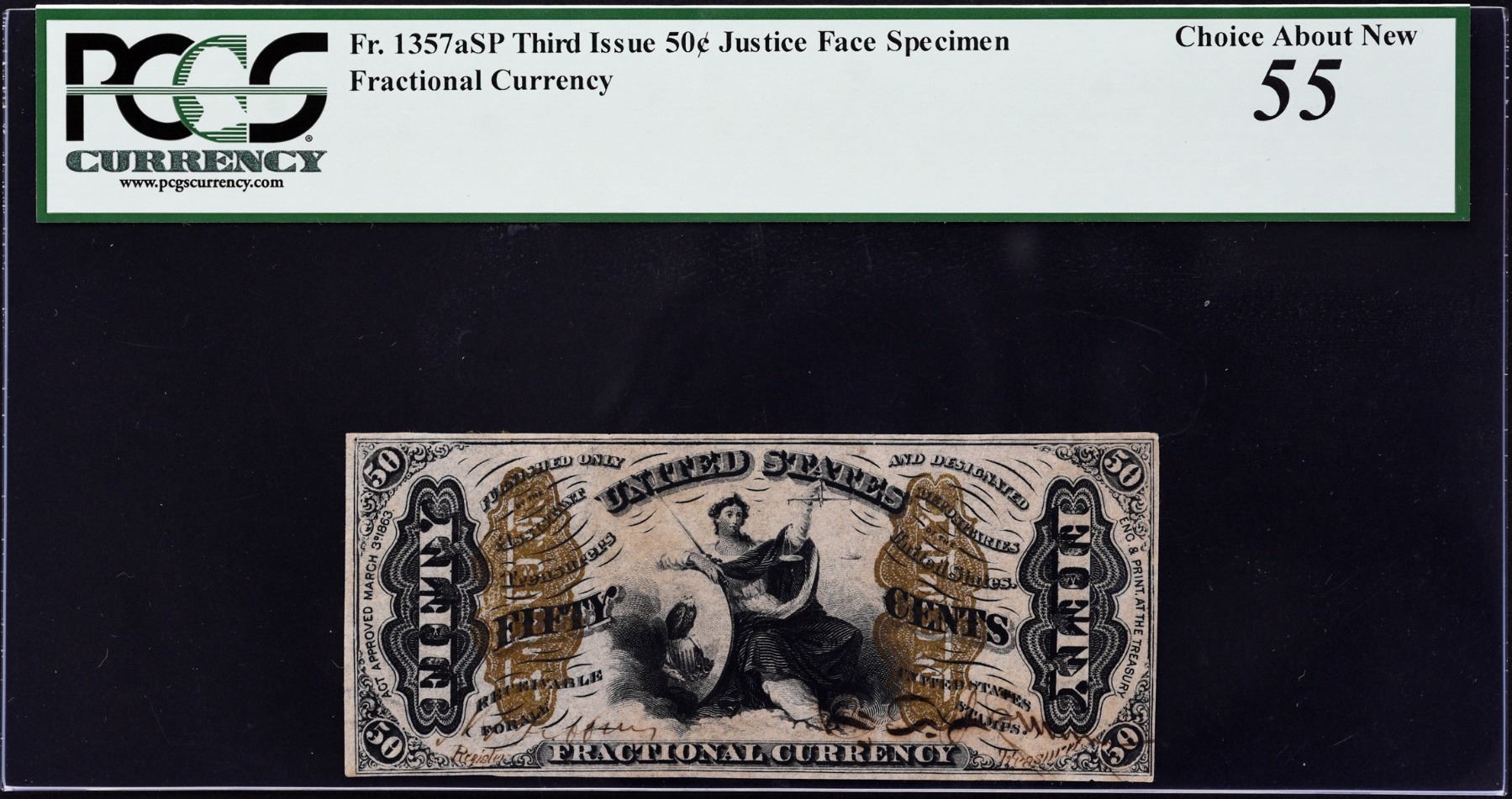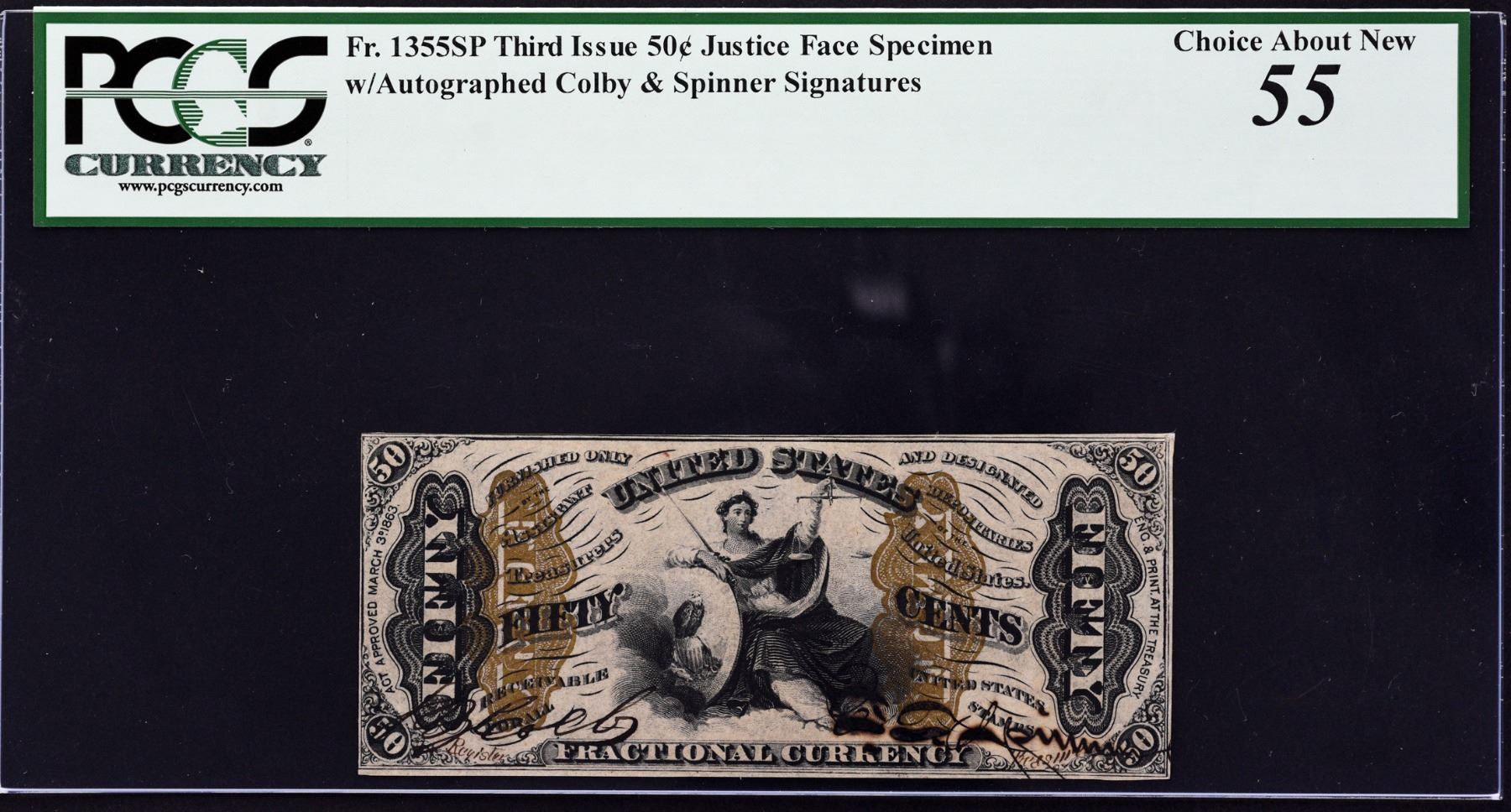 A lot which shows with all being different varities for the Spinner and Justice designs and includes the following; Fr. 1324sp Spinner face in New 62 with the comments "Minor Mounting Remnants on Back from Shield."; Fr. 1328sp Spinner face in Choice About New 58 PPQ; Fr. 1330asp Spinner face in Very FIne 35 with the comments "Minor Mounting Remnants on Back from Shield."; Fr. 1343sp Justice Face in Choice About New 55 with the comments " Small Edge Tear in LR Corner, Minor Mounting Remnants on Back from Shield."; Fr. 1355sp Justice face in Choice About New 55 with the comments "Small Repair in UR Corner."; Fr. 1357asp Justice Face in Choice About New 55 with the comments "Minor Mounting Remnants on Back from Shield."; Fr. 1330sp back in Choice New 63 with the comments "Minor Mounting Remnants on Back from Shield."; Fr. 1331sp back in About New 53.