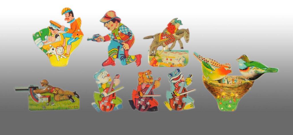 Various makers. German, English and Japanese. 1930s to 1950s. Includes one with birds feeding, one Punch and Judy with baby, one cowboy with two guns, one cowboy riding horse, one solider with machine gun and three various animals playing bass fiddle. Collection of Carl Lobel. Condition (Excellent). Size Largest: 3" T.