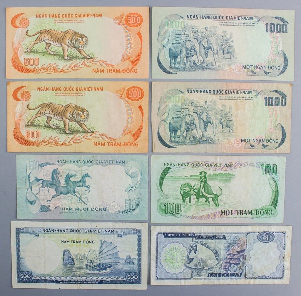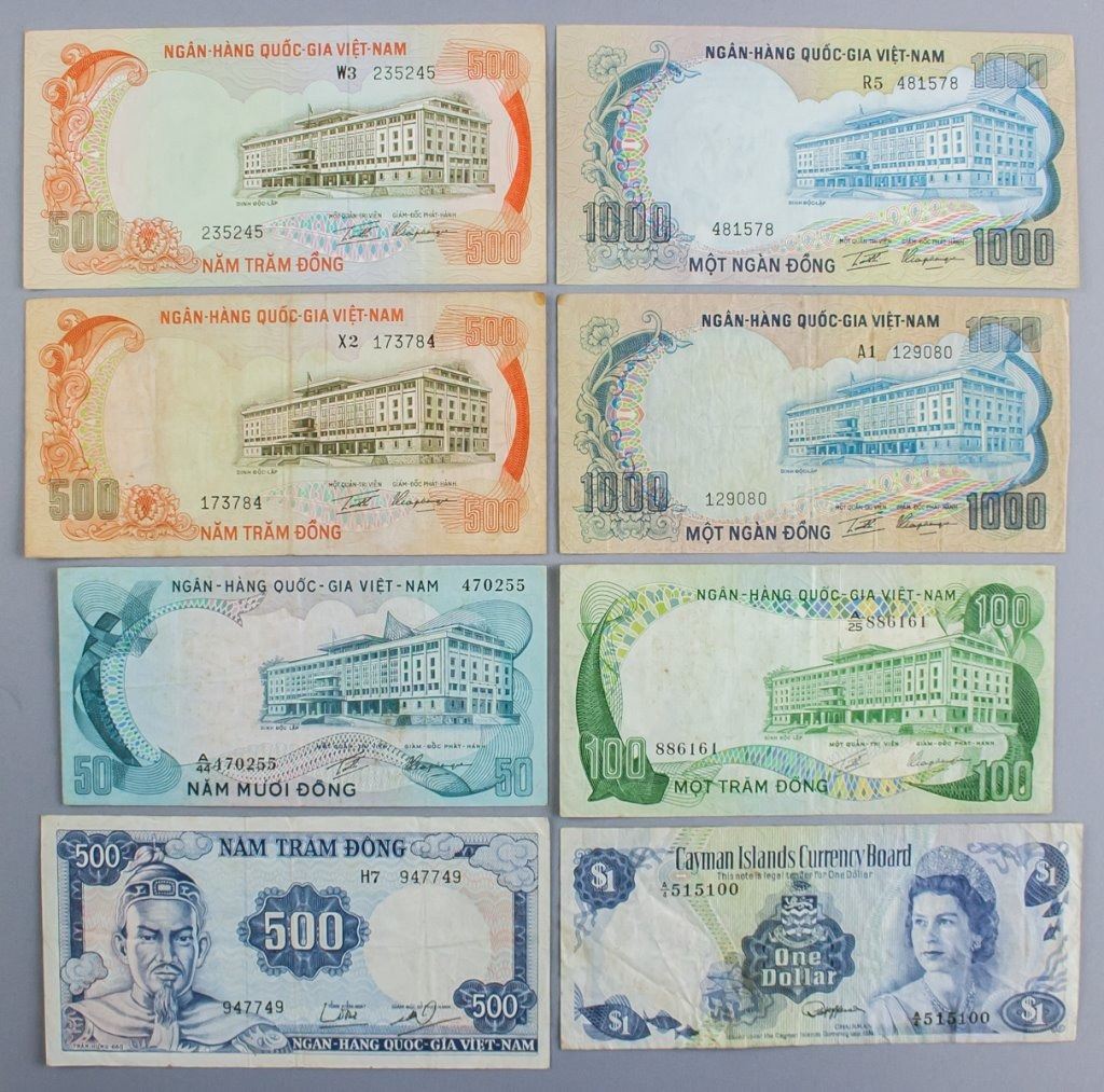 Lot of 8 pieces of paper money from Vietnam and the Cayman Islands. In good condition. Of 50, 100, 500, and 1000 denomination for the Vietnam bills. Of $1 denomination for the Cayman Islands bill.