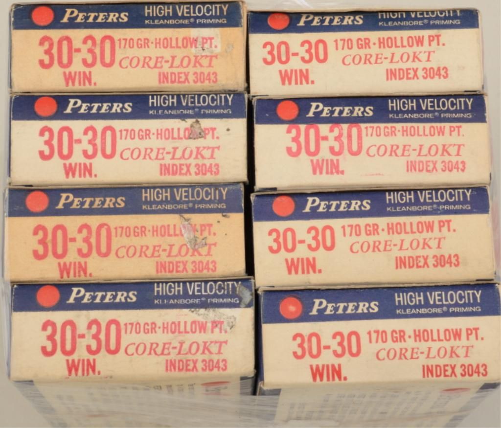 Lot of 8 boxes of Peters .30-30 hollow point ammo. Est.: $50-$75.