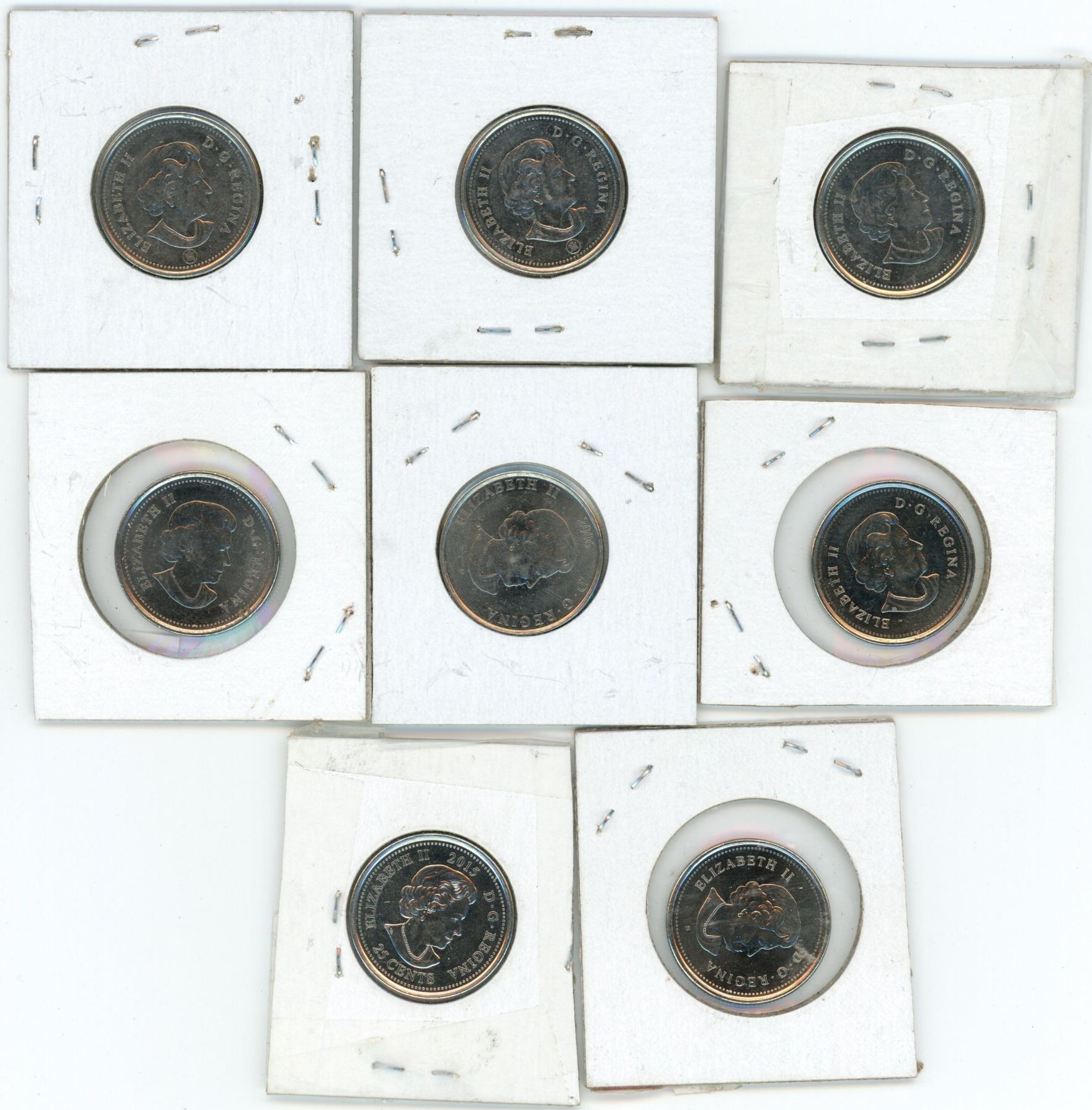 Lot of 8 canadian quarters of various years ( coloured/non-coloured)