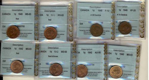 Lot of 8 coins, all CCCS certified coins, includes 1940 MS64RD, 1942 AU50, 1942 MS60RB, 1942 MS63RD, 1945 MS63RD, 1945 MS60 RD, 1949 F12 A off Dent. and 1949 A to Dent. VF20. All problem free examples.