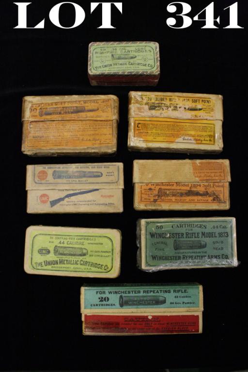 Lot of 8 collector boxes of ammunition including a box of 20 45-60 cartridges by Winchester in old two piece box showing some damage to the sides and stamped “From B. Slotterbeck” cartridges are show corrosion,box is in overall fair condition; a box of UMC .44 Winchester caliber with green label and two piece box in overall fair to good condition with rounds showing corrosion; a sealed box of .44 caliber cartridges for“Winchester Rifle model 1873” with picture of cartridge on the lid and a picture of the ’73 carbine on the side of the box, green label with box in overall good condition; .38 caliber Long rim-fire cartridge box of 50 by UMC in overall fair condition with corrosion to the bullets; a box of 20 .30 Remington cartridges by Remington-UMC with box and cartridges in overall good condition; a box of .30 Winchester caliber for the Model 1894in overall fair condition; a box of 30-220 caliber Model 1895 soft point cartridges by Winchester in fair condition and a partial box of mixed head stamp .35 caliber soft point cartridges by Winchester in well-worn