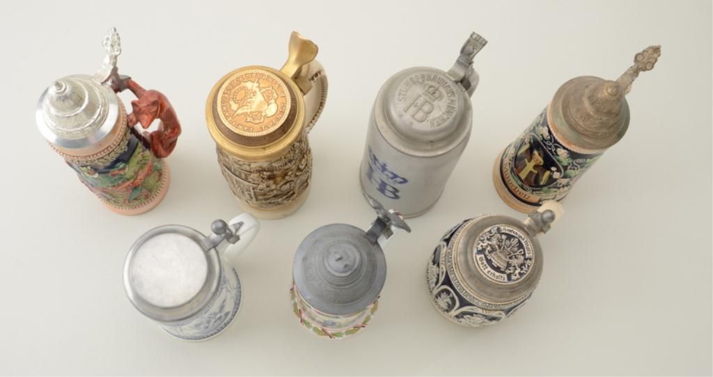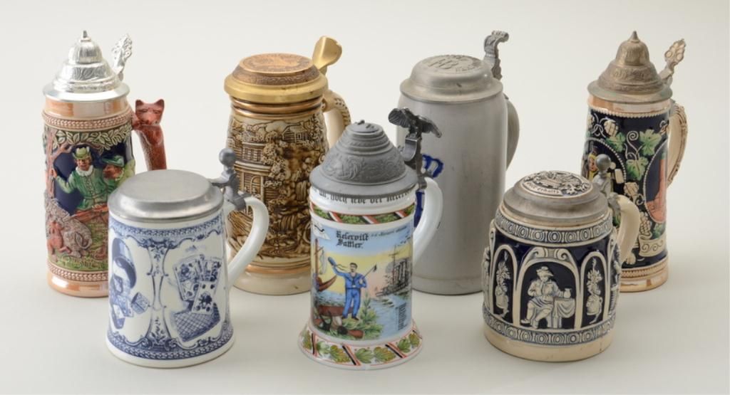 Lot of 8 misc. beer steins in various sizes and styles; great for decorations around the bar or for use after a hard day at the plant. Est.: $75-$150.