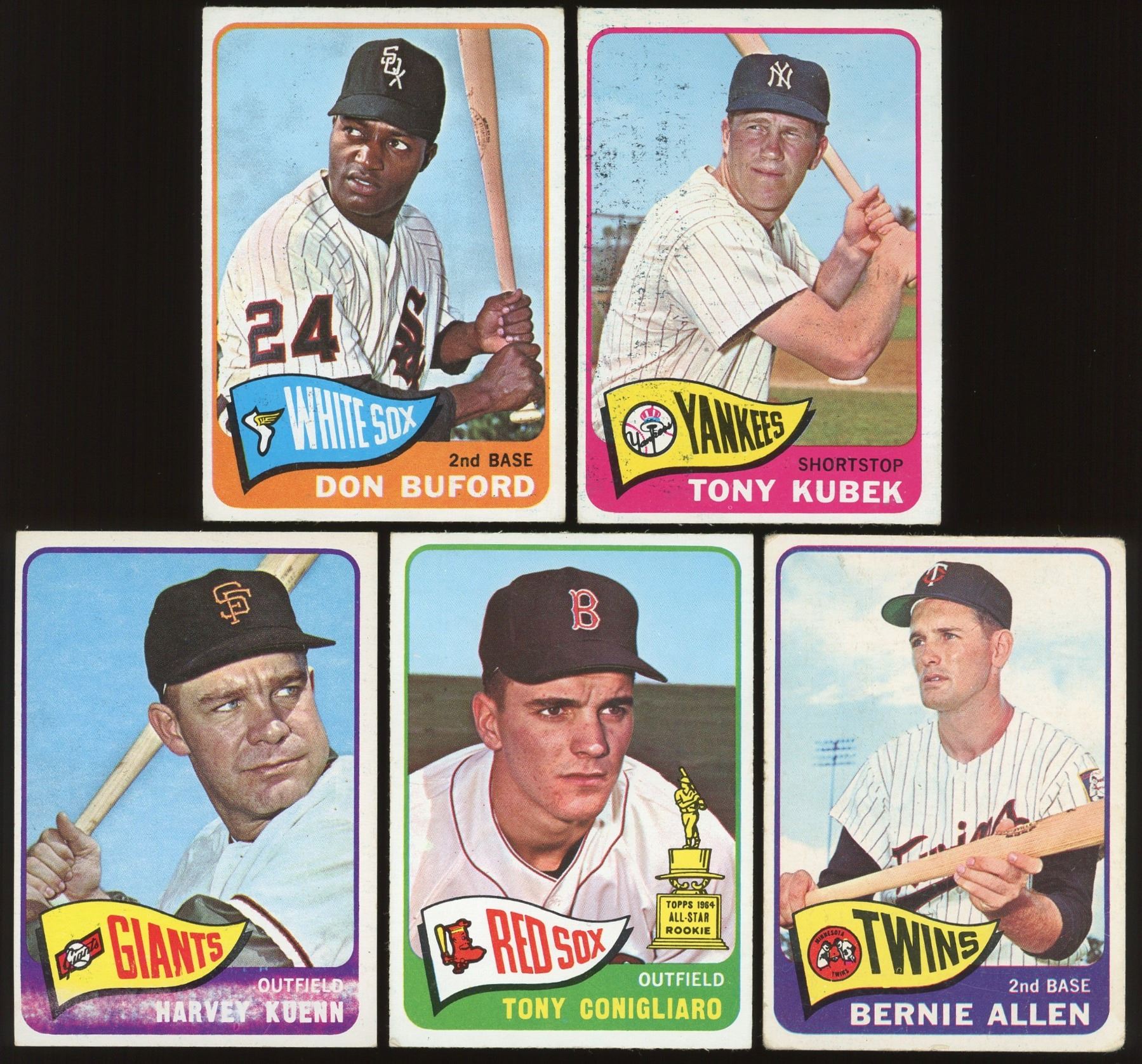 Lot includes 3 Topps + 5 O-Pee-Chee baseball cards (8 total) from 1965, includes stars/HOFers*: #8 OPC NL ERA Leaders - Koufax* & Drysdale* (GD-VG), #47 OPC Tommy Harper (VG-EX), #55 OPC Tony Conigliaro 2Y (VG-EX+/EX), #65 OPC Tony Kubek (VG), #81 OPC Don Buford 2Y (VG-EX+), #103 Topps #103 Harvey Kuenn (VG-EX), #116 Topps Bob Tolan RC (GD-VG), #237 Bernie Allen (VG).