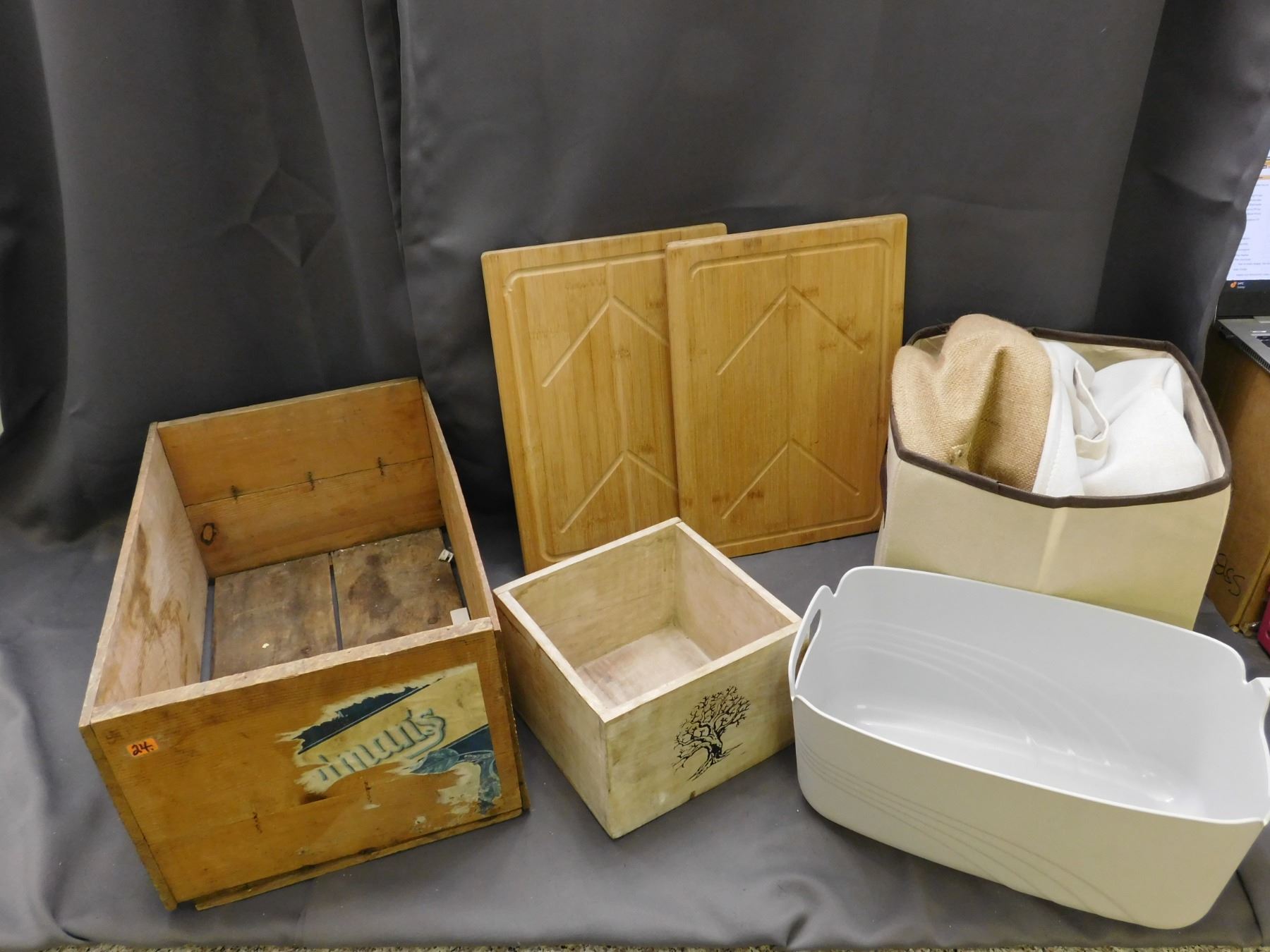 Lot of 8pcs Wooden Serving Boards with Drip Inlay, Crate, Box and Fabric Storage Cube, Bags, etc