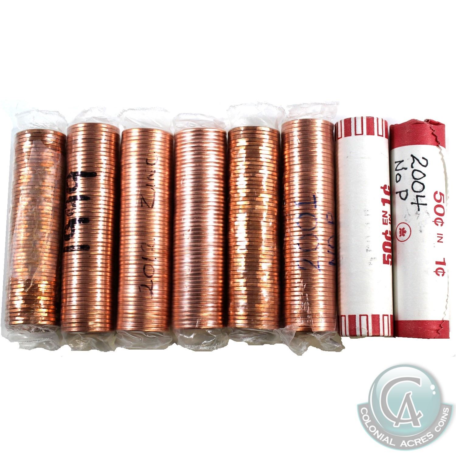 Lot of 8x 1991-2012 Canada 1-cent Original Rolls of 50pcs. You will receive 1991, 1992, 1999, 2001, 2x 2004, 2008 & 2012 Non-Magnetic (some rolls may have tears & one of the 2004 rolls has writing and is unwrapped at one end). 8pcs