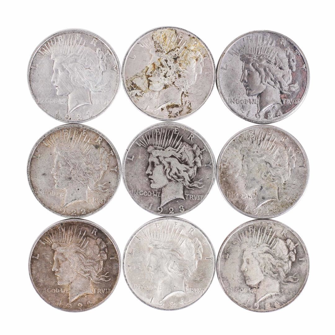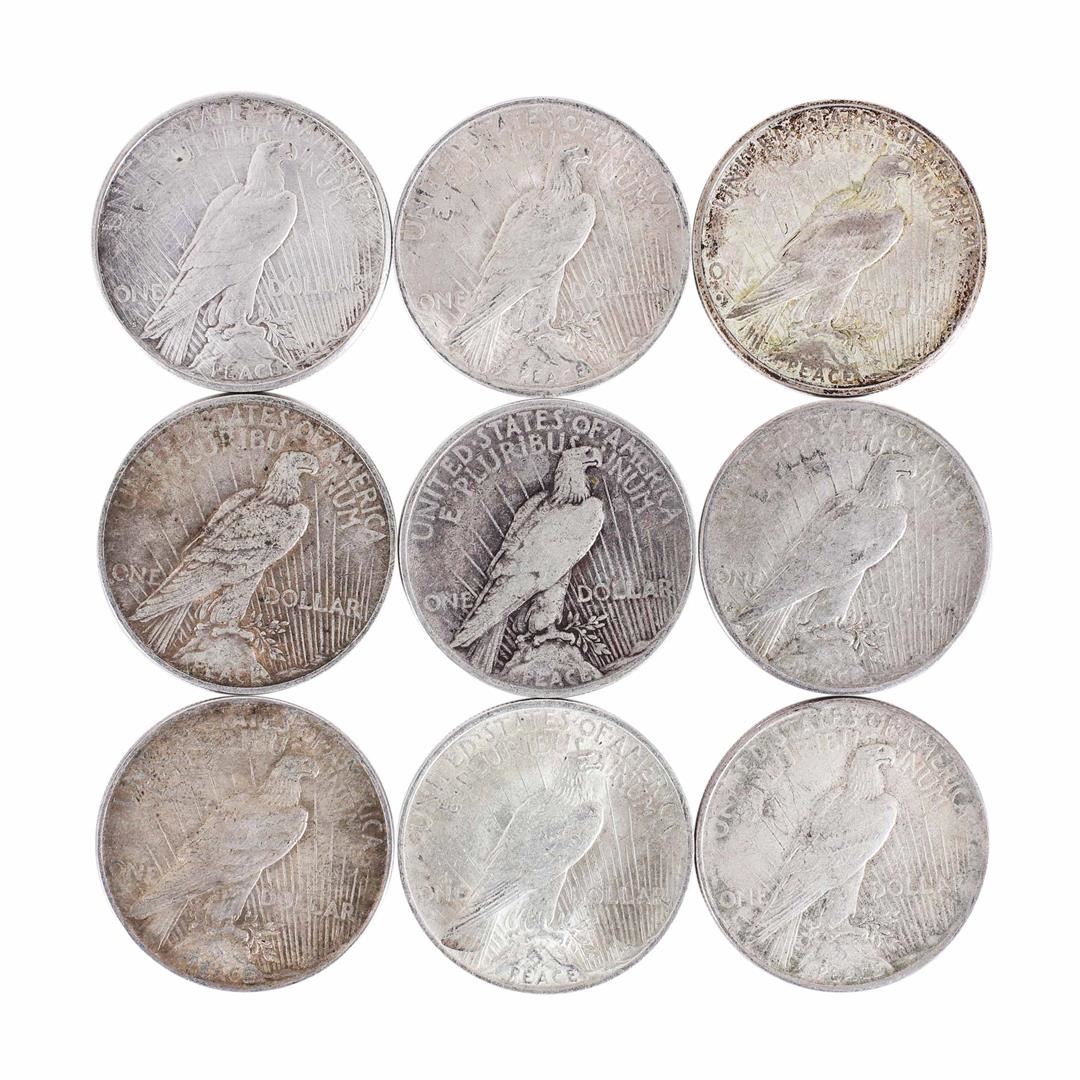 One Lot of (9) $1 Peace Silver Dollar Coins.