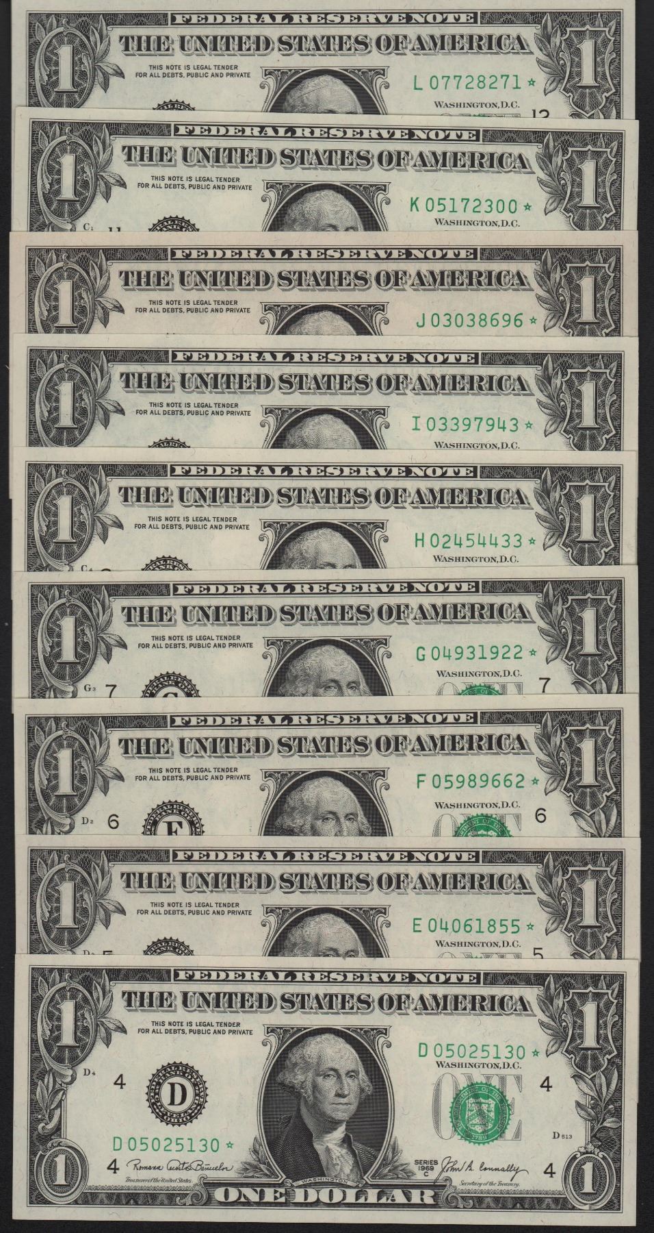Lot of (9) 1969C $1 Federal Reserve Star Notes. All 9 districts.