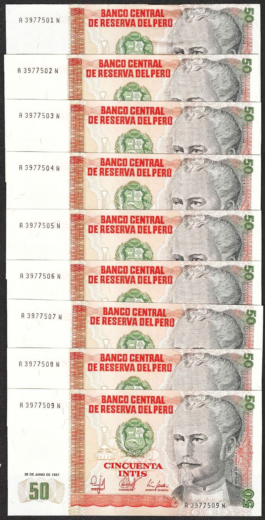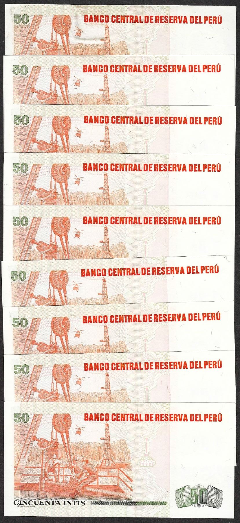 One Lot of (9) 1987 Peru Cincuenta Intis Uncirculated Bank Notes.