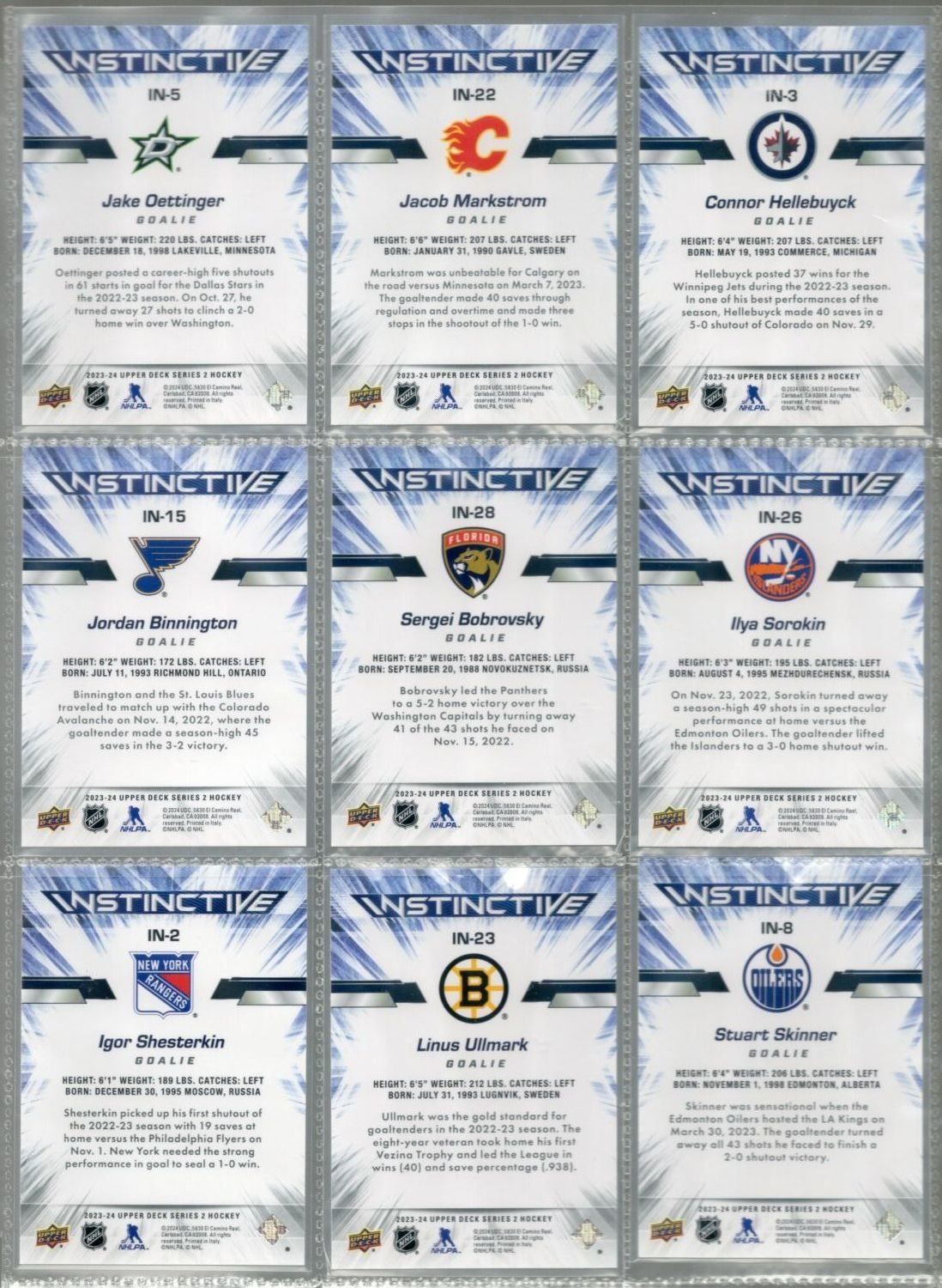 Lot of 9 2023-24 Upper Deck Series 2 Instinctive Goalie Inserts