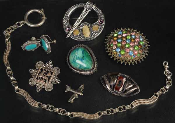 Description Includes six pins, one pair of earrings, and one necklace in Continental Silver. One pin has multi-colored stones, one has polished stones, one has a large green stone and is made in Israel, one is a deer with marcasites, one has a cameo in center with floral décor and marked "Sterling", one airplane marked "Sterling", and the pair of earrings are sterling with green stones. Condition (Excellent). Size Necklace: 12" L.
