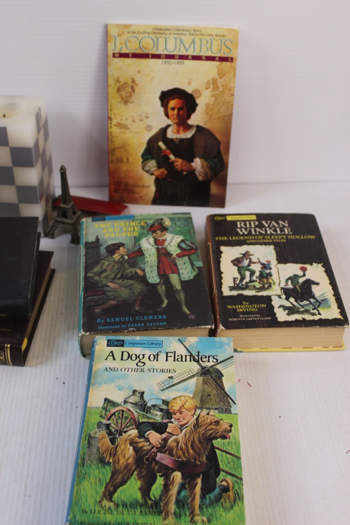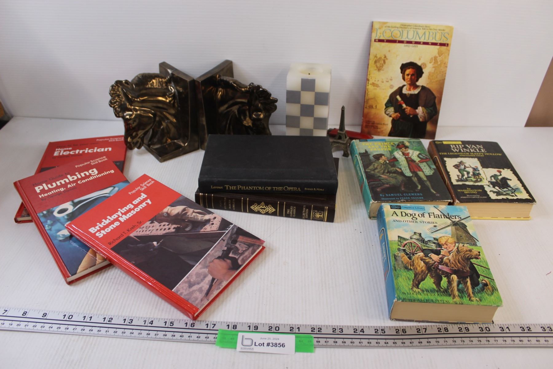 Lot of: (9) Books: Phantom of the opera, Home Fix-it books, Rip Van Winkle, Misc., Bookends (one broken but glued), Misc.
