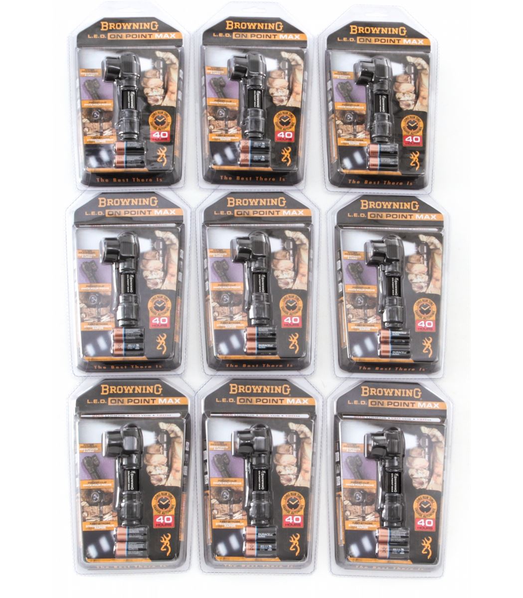 Lot of Nine (9) Browning LED On-Point Max Flashlights, with batteries. All brand new in original packaging. Retail @ $59.95/each. Est.: $250-$350/lot. (Field Time)