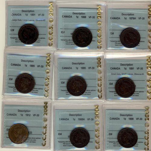 Lot of 9 CCCS VF-30 graded Large Cents; 1876H, 1888, 1891 LDLL Obv#2, 1891 SDSL Obv#3, 1895 (2), 1899, 1900H, 1912