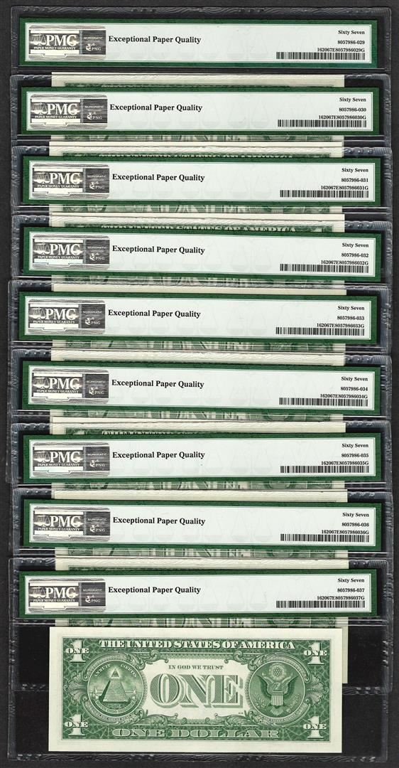 One Lot of (9) Consecutive 1957A $1 Silver Certificate Notes PMG Superb Gem Unc. 67EPQ. PMG Certified.