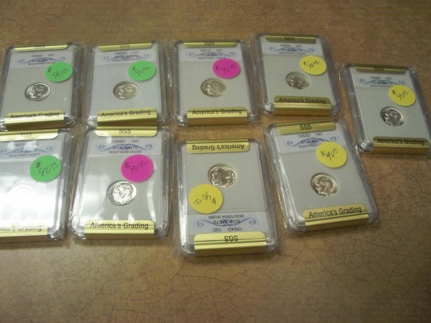 Lot of 9 Graded MS-70 Silver Roosevelt Dimes, Highest possible grade