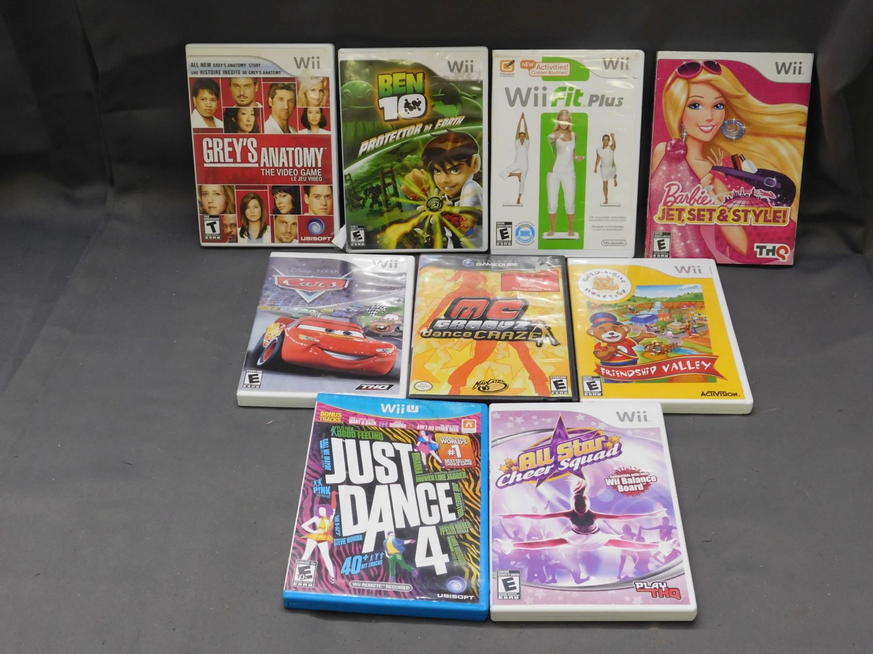 Lot of 9 Nintendo Wii Games, (1 Wii U and 1 GameCube) Greys Anatomy, Ben 10, Barbie, Just Dance