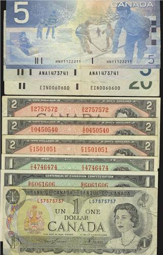 Lot of 9 RADAR notes, all with moderate circulation. Includes BC-37d #CI4746474, 1954 $2 BC37c #FR1501051, BC-37d x 2 #OG0450540 and RG2757572, 1967 $1 #GP606-606, 1973 $1 #LS7575757, 1986 $5 #ANA1473741, 1991 $20, EIN0060600 and 2002 $5 #HNY1122211. Aver