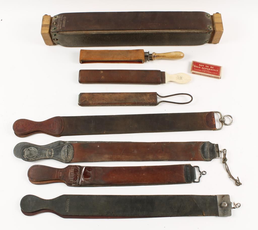 Circa 1800's- 1920's. (1) Marked "PUMA" with wood handle, (1) Stamped "LIPSHAW MFG CO DETROIT U.S.A. DIAMOND" mounted on wood. (1) Marked "AUTOSTROP SAFETY RAZOR CO". (1) Marked "TRAVELER 859 MADE IN U.S.A." And (4) others.