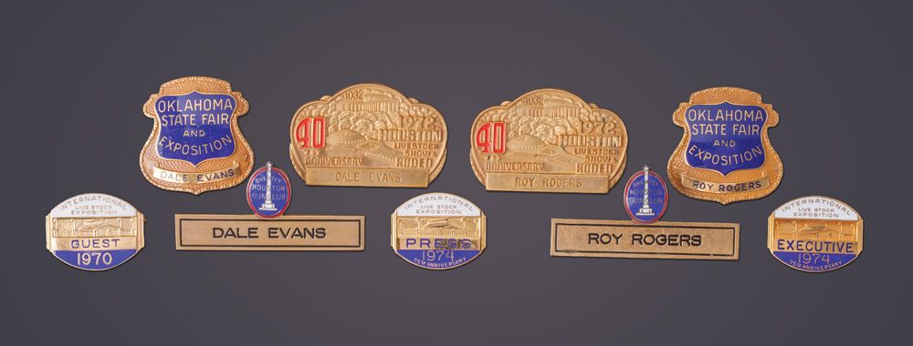 Lot of 9 Roy Rogers and Dale Evans Badges & Pins. a) A pair of Oklahoma State Fair shields, enameled dark blue on gold with names in banners, beautiful detailed badges. 1 9/16" tall x 1 1/2". b) A pair of Greater Houston Gun Club name tags with red, white and blue enameled oval logos. 2 3/8" wide by 1 1/4" tall. c) International Live Stock Exposition, 3 total, 1970 Guest -1974 Press - 1974 Executive, inlaid enamel with detailed relief. d) 1972 Houston Livestock Show & Rodeo. set or badges, 40th Anniversary. 1 3/8" tall by 2 1/4" wide. All from a board mounted in the Museum. Provenance: Roy Rogers and Dale Evans Museum, Victorville, CA and Branson, MO;. to Christie's, July 2010; to present owner. Includes Certificate of Authenticity signed by Roy "Dusty" Rogers, Jr.