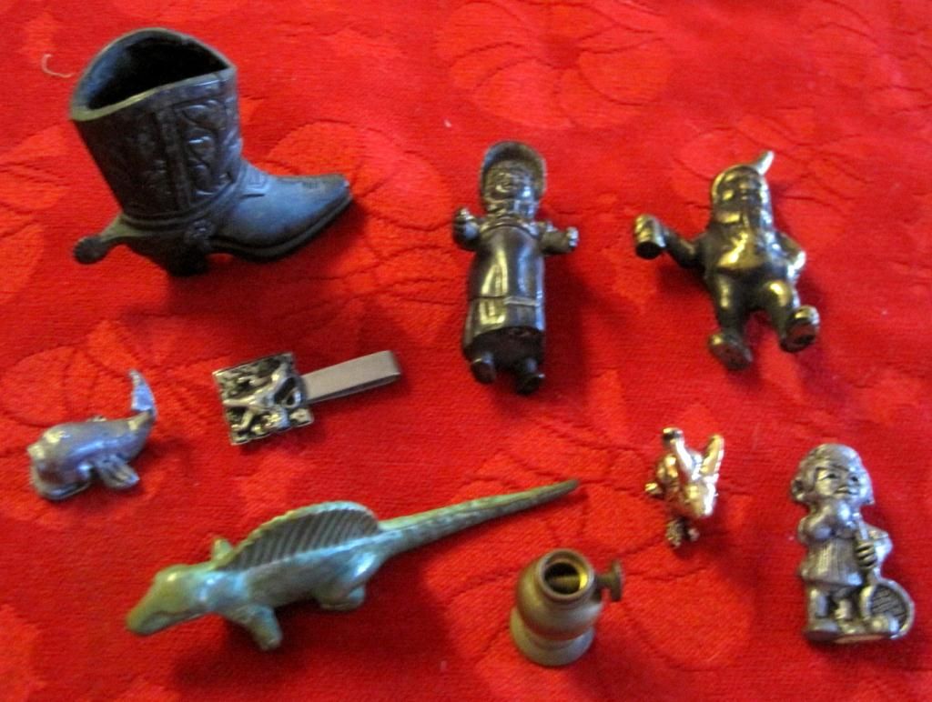 This Lot is for 9 Pieces of Cast Iron, Lead & Other Metal Pieces. Some of the items included are: 2 1/2” Tall Cowboy Boot, 4” Long Cast Iron Dinosaur & More !!!.