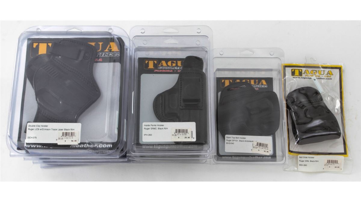 Lot of Nine (9) Tagua Black Leather Holsters, for Ruger LC9, Ruger LCR, Ruger SR9C, Ruger SP101. All brand new in original packaging. Retails @ $400/lot. Est.: $200-$300/lot. (Field Time)