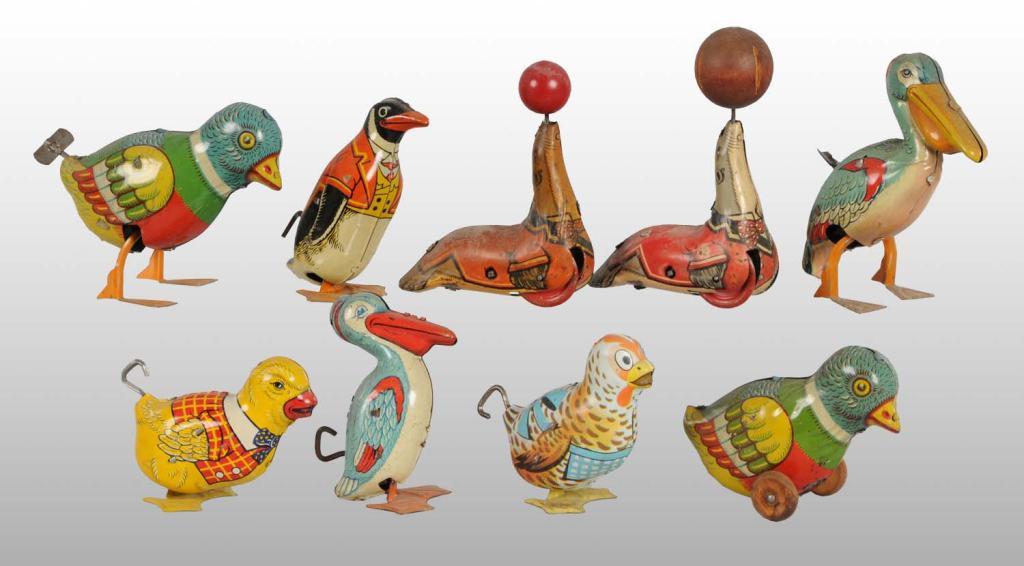 Description Includes eight working wind-up toys and one bird push toy on wheels. Six toys have the Chein Shield mark, two have the earlier Chein circle mark, and one Pelican is unmarked. Also includes two versions of the seal toy, two versions of the chick toy, two version of the bird toy, two versions of the pelican toy, and one version of the penguin. All toys have very little wear and would clean to a better grade. Condition (Excellent). Size Largest: 5" L.