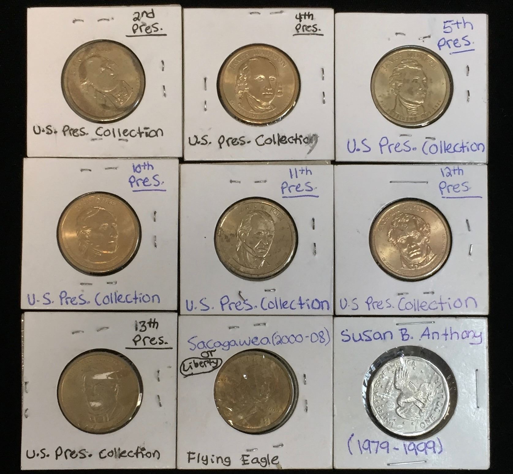 Lot 87; Lot of 9 - US $1 Presidential Dollars, John Adams, James Madison, James Monroe, John Tyler, James K. Folk, Zachary Taylor, Millard Fillmore, Susan B. Anthony, Sacagawea