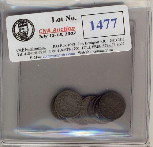 Lot of 9 "Victorian" Five cents silver. Includes 1870FB,1870RB (2),1872H,1874H cross (2),1874H Plain, 1883H. Average G4.