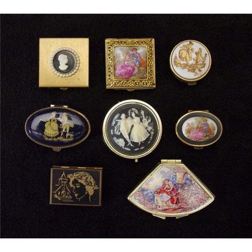 Lot of nine vintage pill boxes mostly decorated with courting scenes. In good used condition with minor signs of wear as shown. Please ask questions, request additional photos and shipping costs before buying.