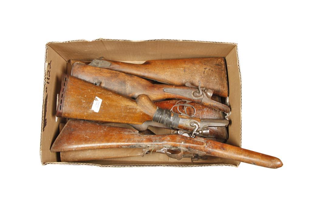 Lot of 9 Wood Shotgun Stocks Consists of stocks for early double barrel shotguns made in Belgium or Sweden. Most are older models with some parts attached. Most of the wood is solid and just needs to be cleaned up for reuse.Consists of stocks for early double barrel shotguns made in Belgium or Sweden. Most are older models with some parts attached. Most of the wood is solid and just needs to be cleaned up for reuse.