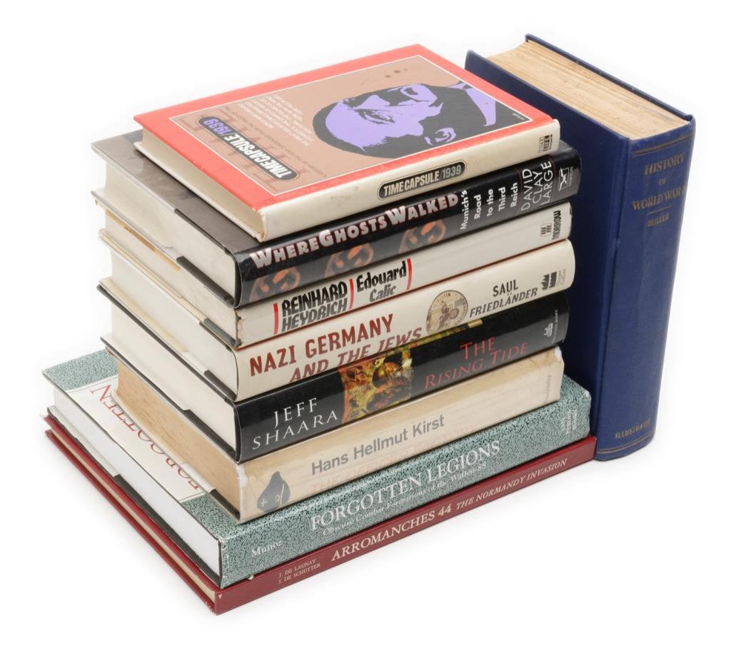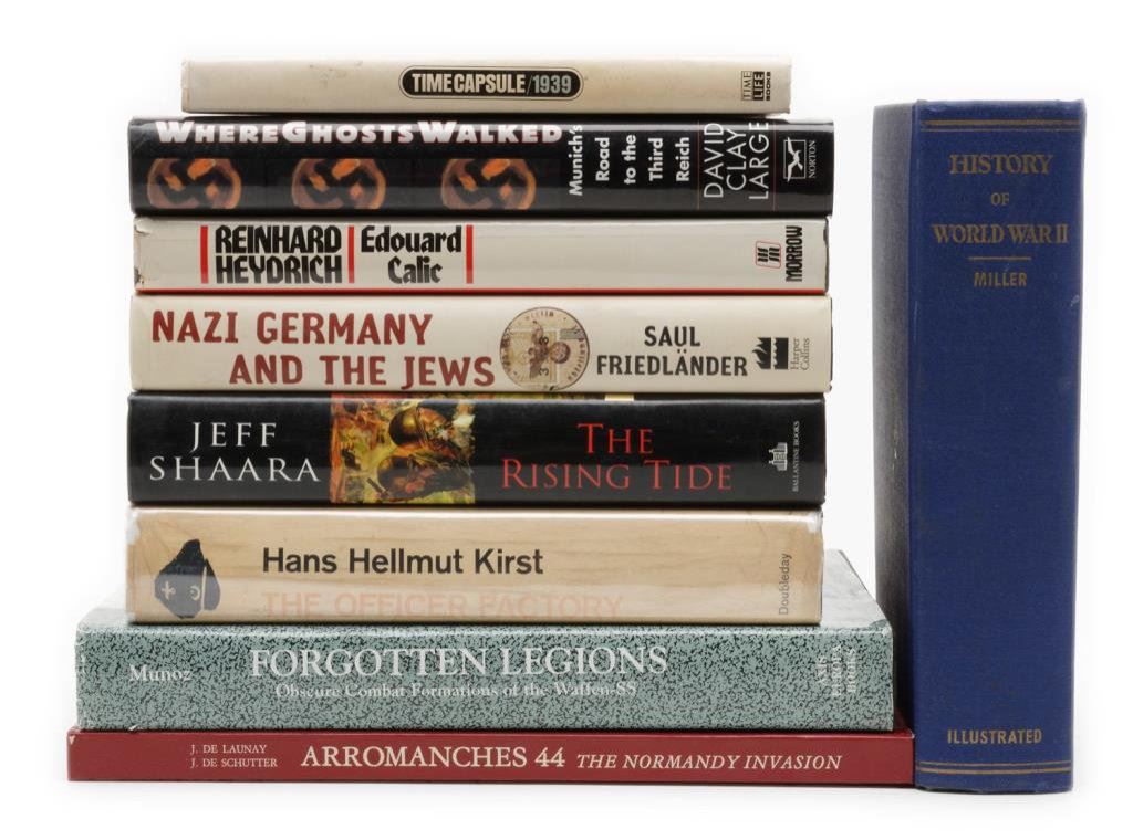 Lot of 9 hardback books related to WW II events including History of WW II (Armed Services Memorial Edition) by Miller; Forgotten Legions by Munoz and The Rising Tide by Shaara. Est.: $75-$100.