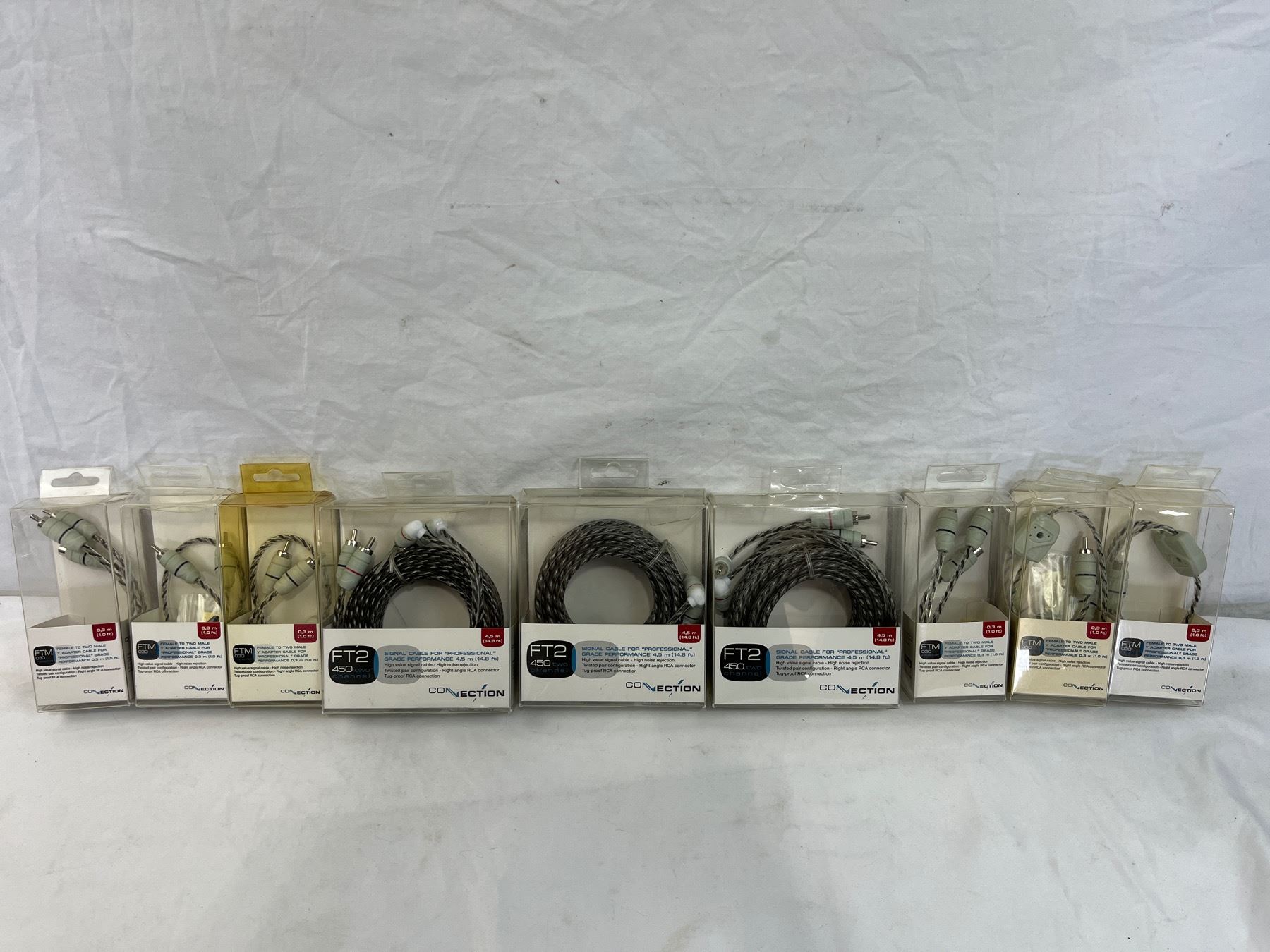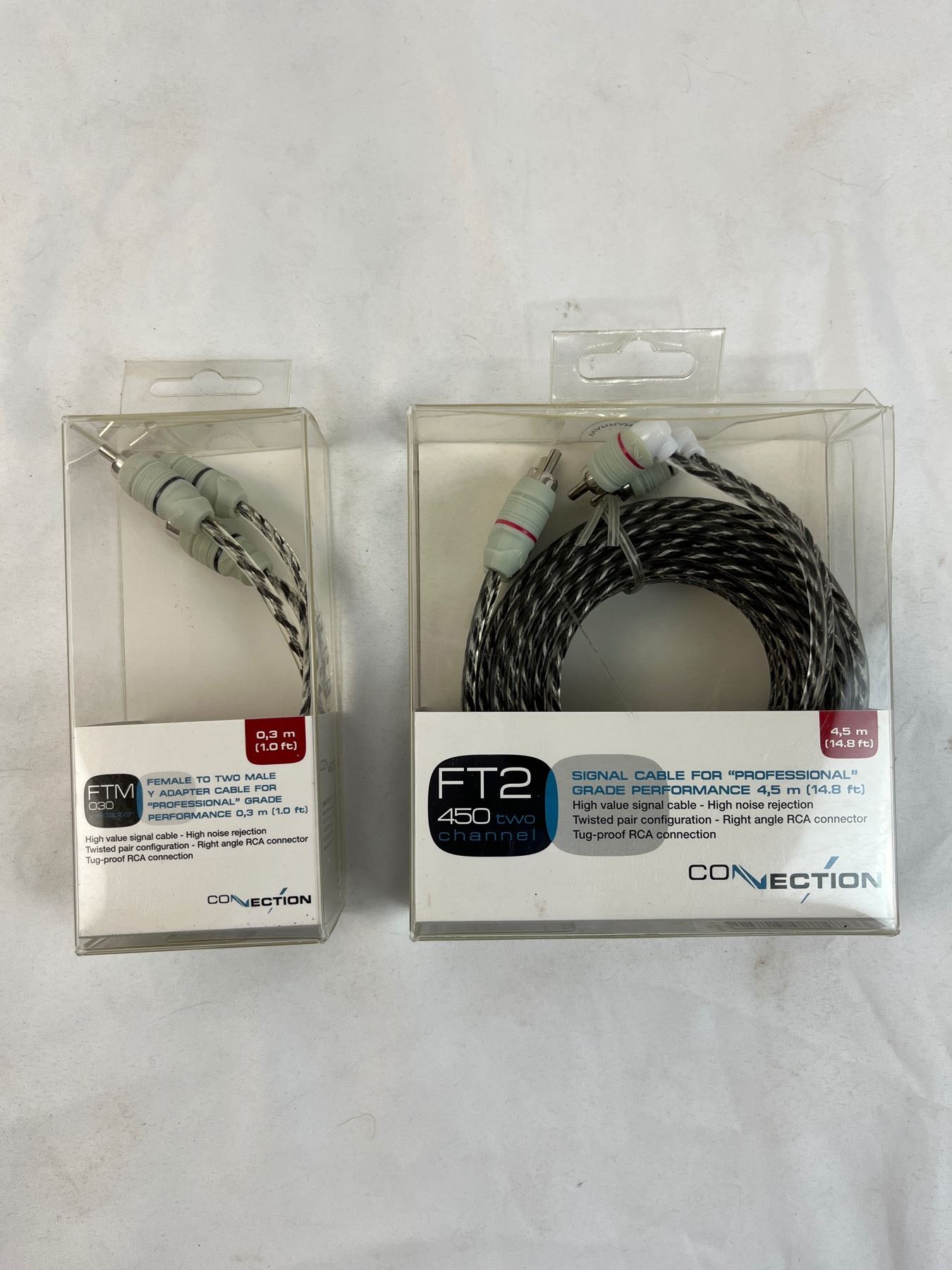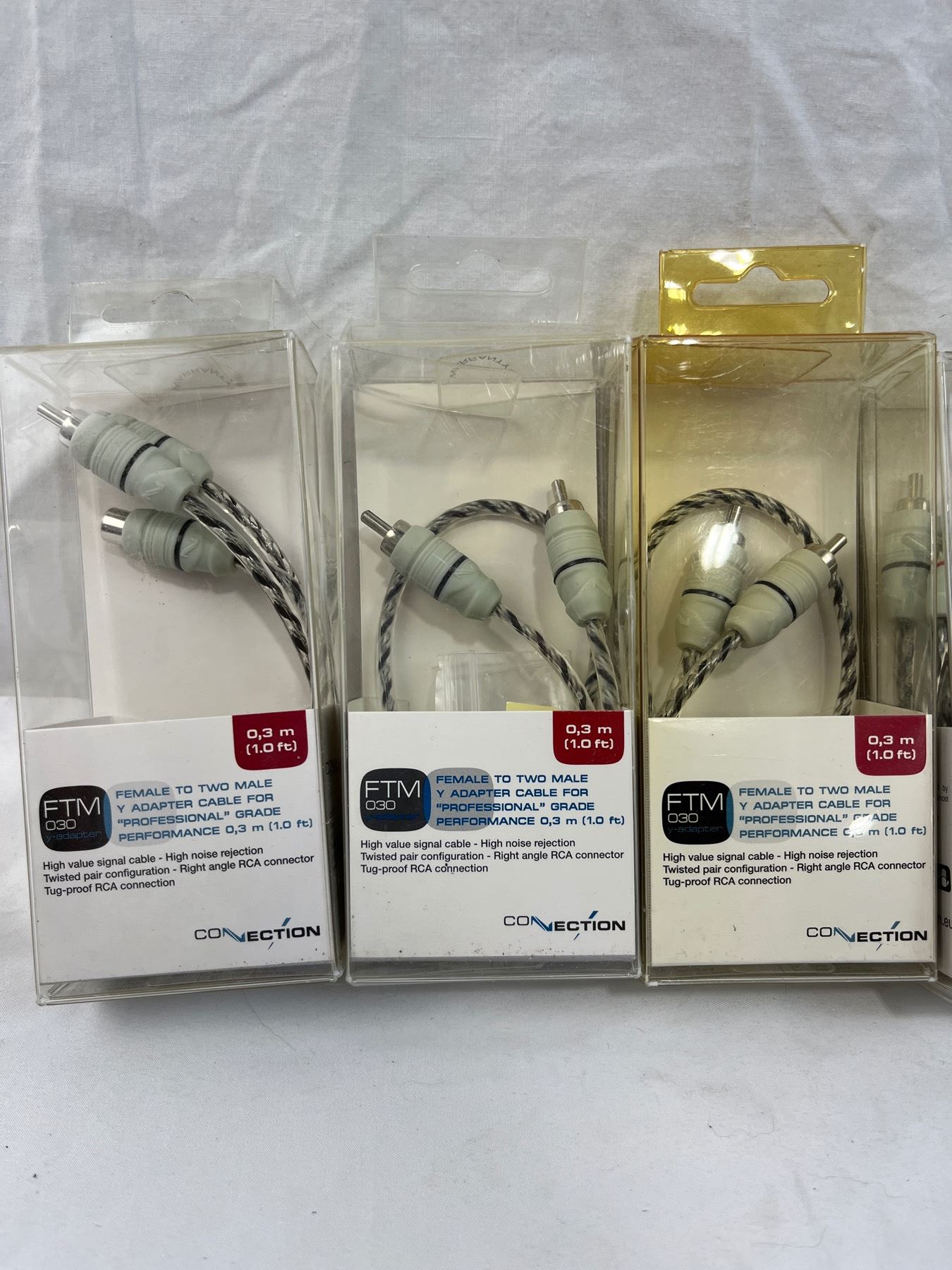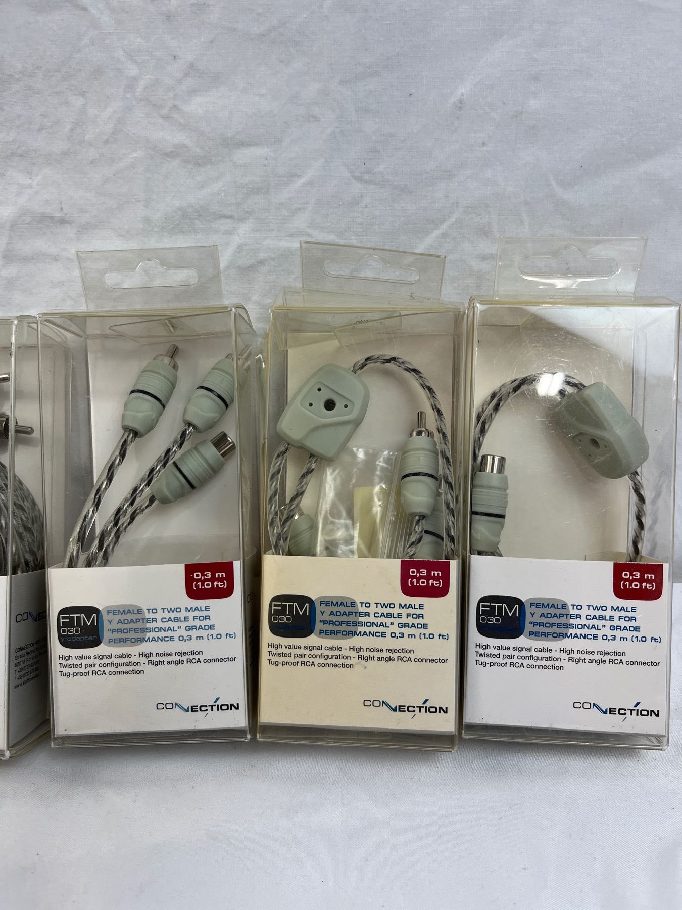 6qty ftm-30 y adapter 1 foot length female to two male. 3qty 14.8ft FT2 450 two channel right angle RCA connector cables.
