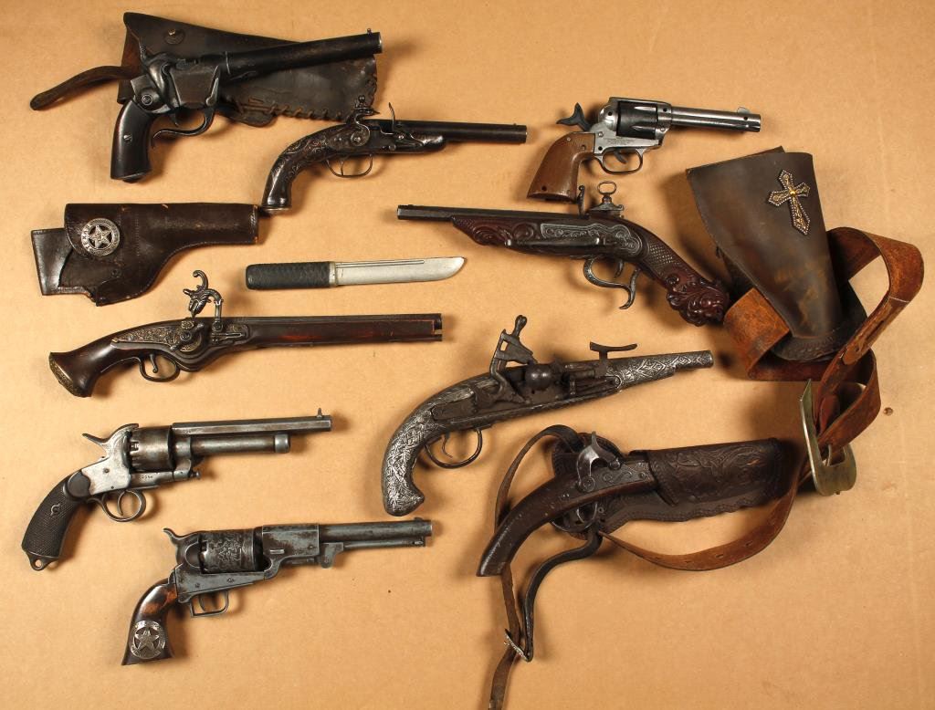 Lot of 9 replica toy guns including a Sharps drop breech pistol with leather holster; a Colt 3rd Model Dragoon revolver; a LeMat revolver/shotgun pistol; a Wheelock pistol, holster and belt; a miquelete pistol; a flintlock pistol with wire inlaid stock; a conversion pistol with tooled leather holster; a miquelete pistol with belt hook and a Single Action Army revolver with holster, badge and rubber knife. A large lot of modern replicas of many popular antique guns. Est.: $270-$540.