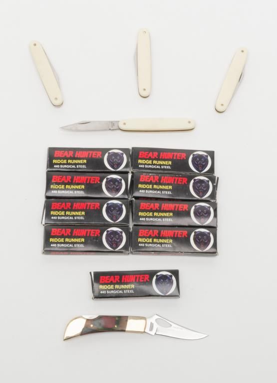 Lot of 9 single blade pocket knives with wood scales, like new in their cardboard boxes, each approx. 3” overall and 4 additional single blade pocket knives in fine condition. Est.: $50-$75.