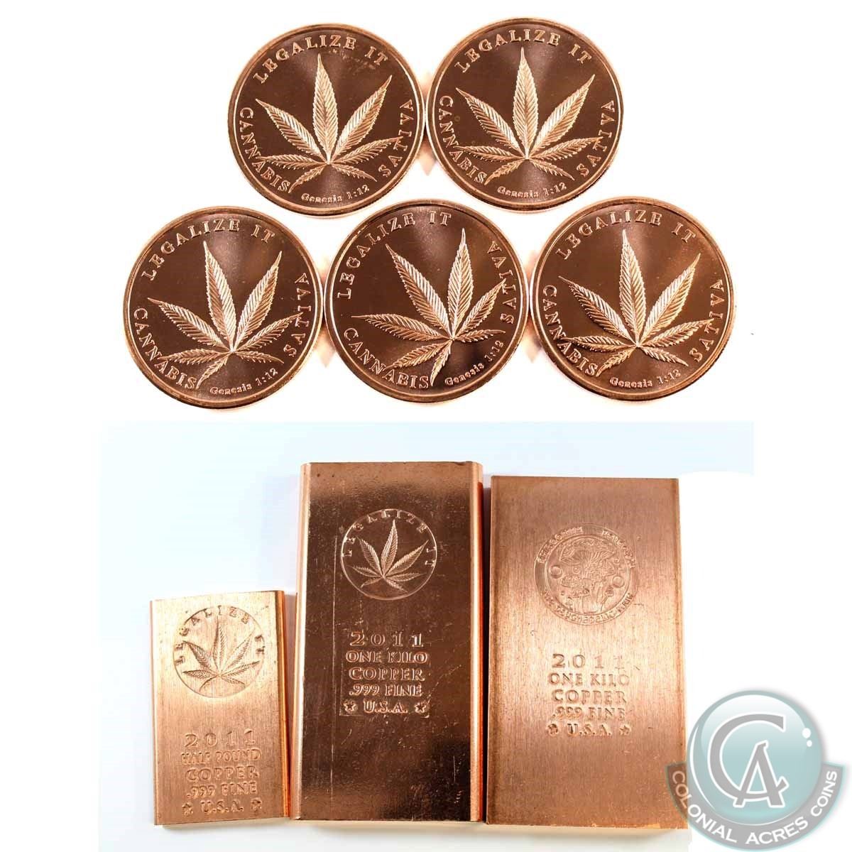 Lot of .999 Fine Silver Copper. You will receive 5x 1oz "Legalize It", 1 kilo "Legalize It", 1 kilo "Shroomin" & Half Pound "Legalize It". 8pcs total (TAX Exempt)
