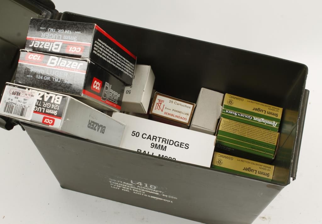 Includes approx (1100) rounds from various manufacturers such as Remington, Blazer, American Eagle, Fiocchi, and more. In large green metal ammo can.